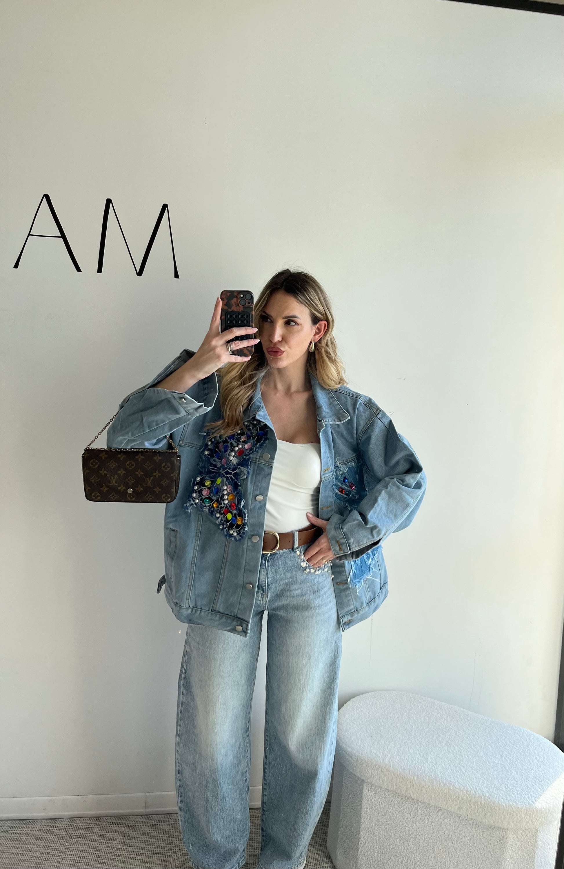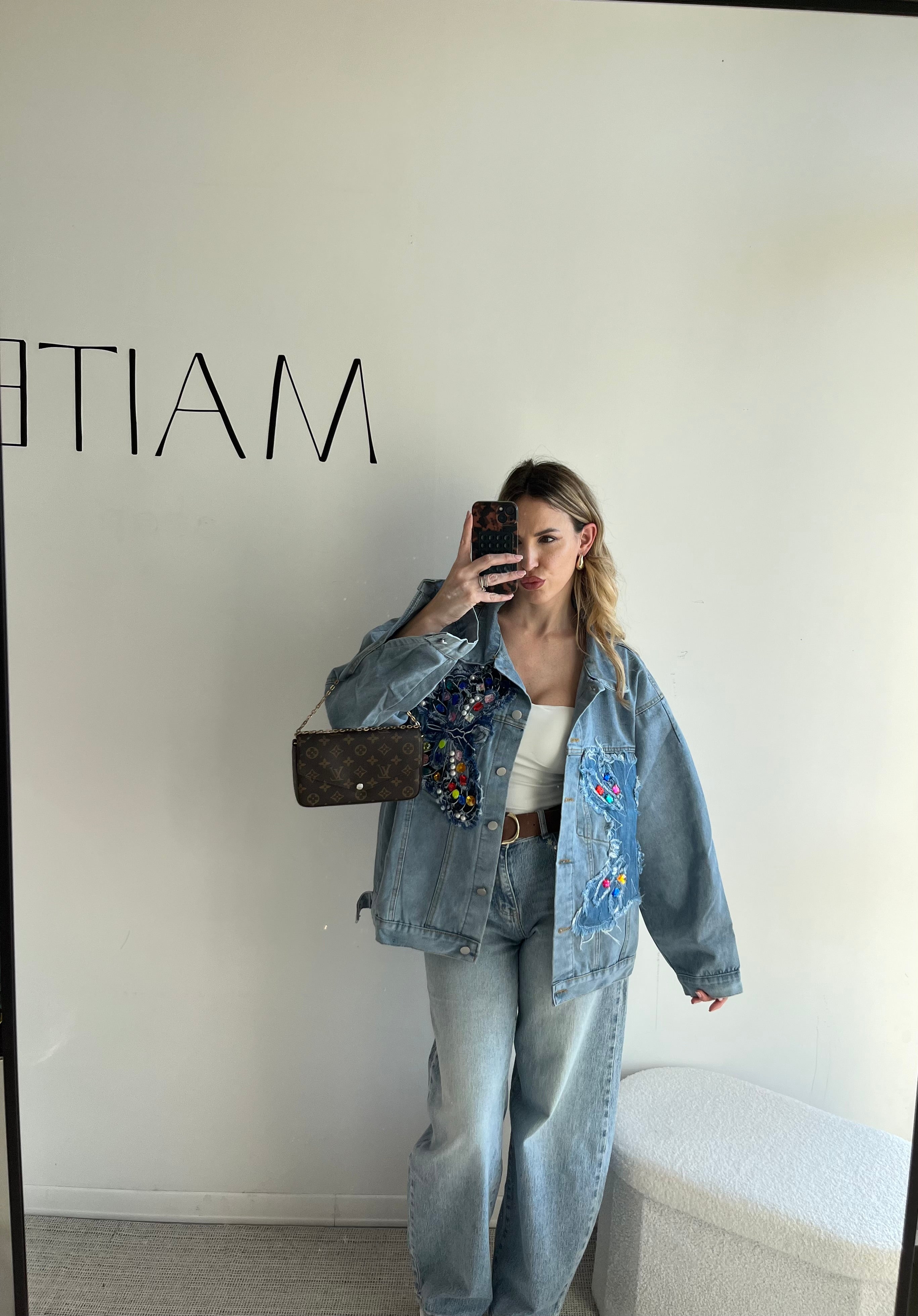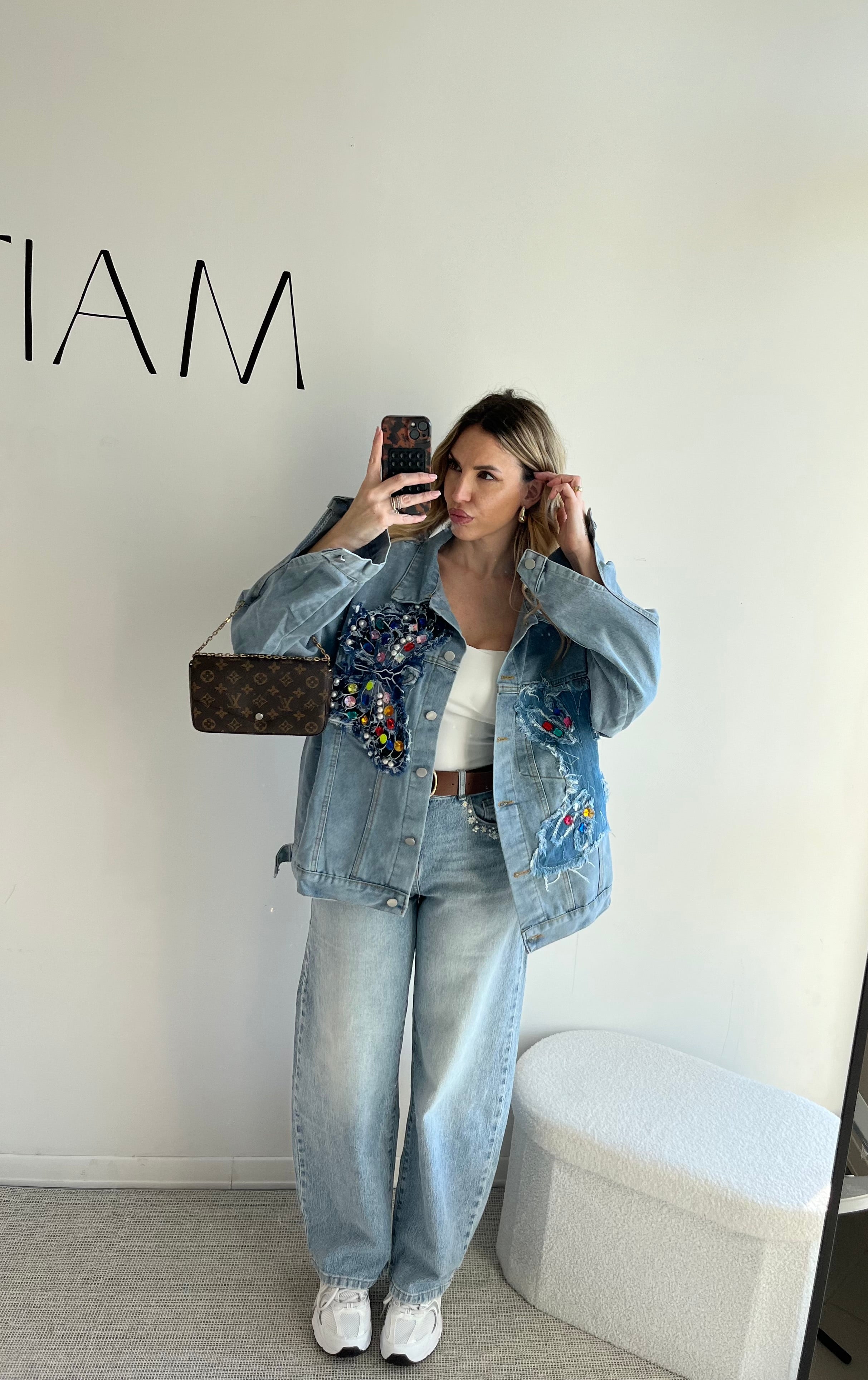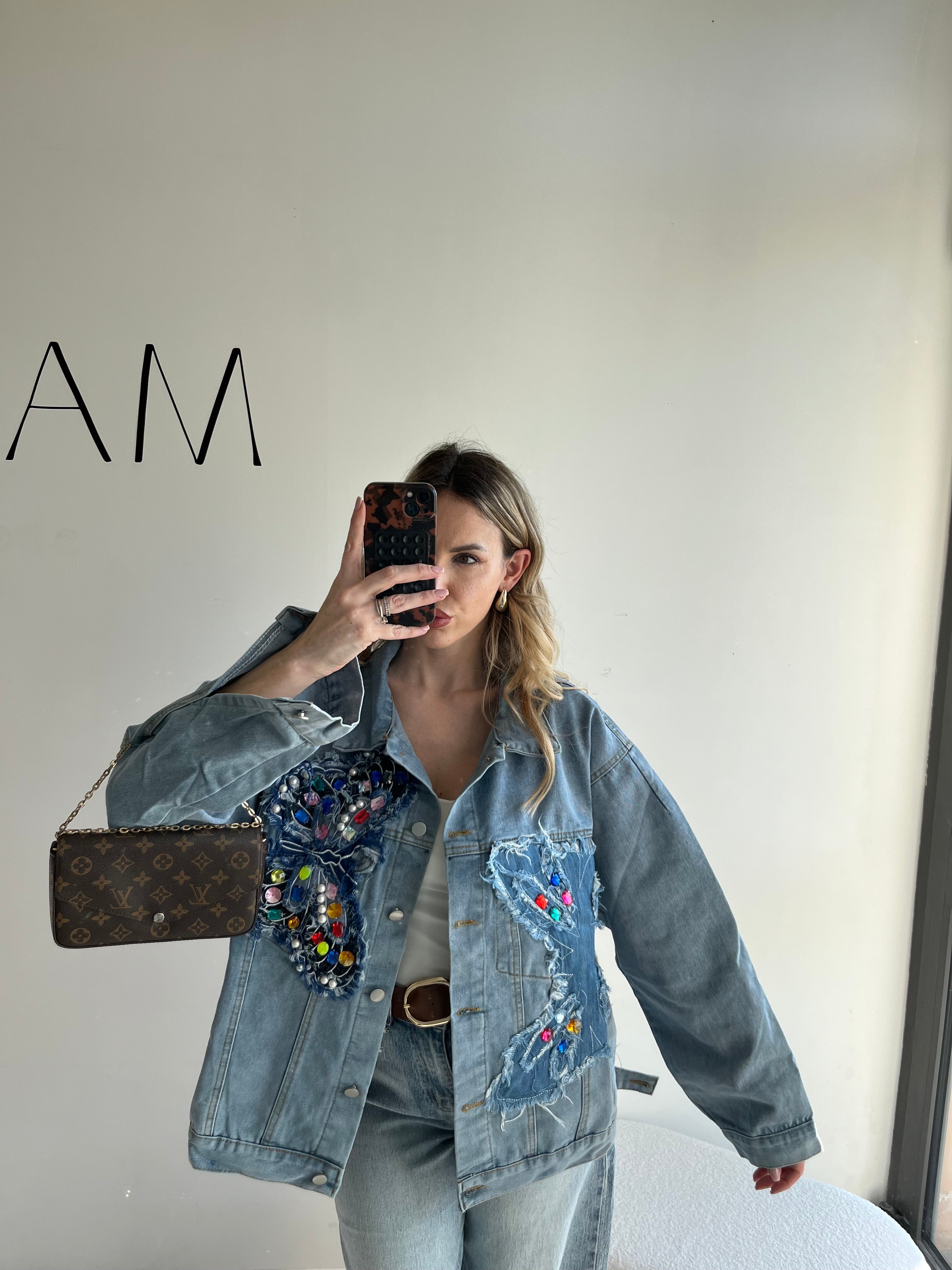 Giacca in jeans con ricamo farfalla e applicazioni pietre.