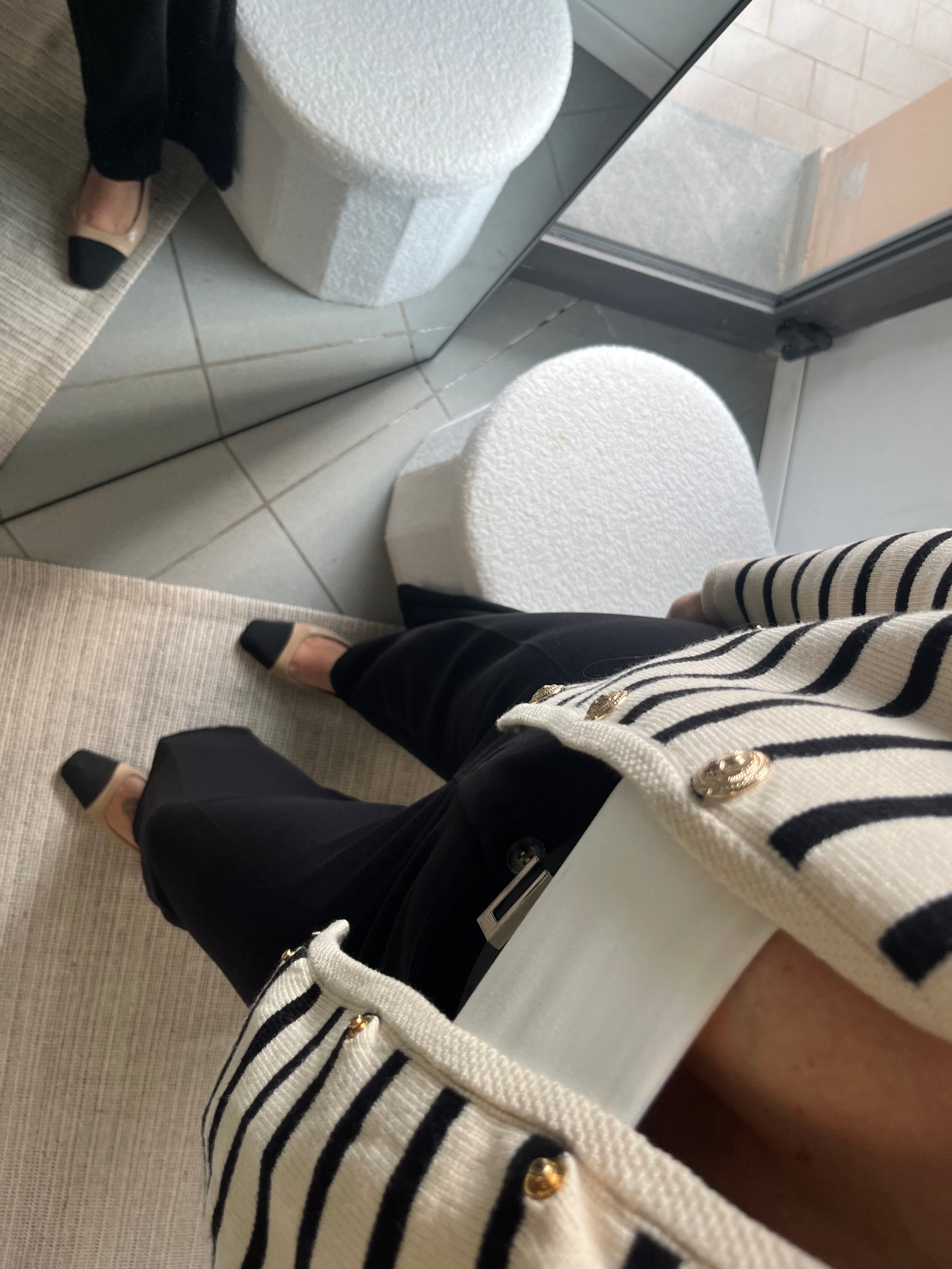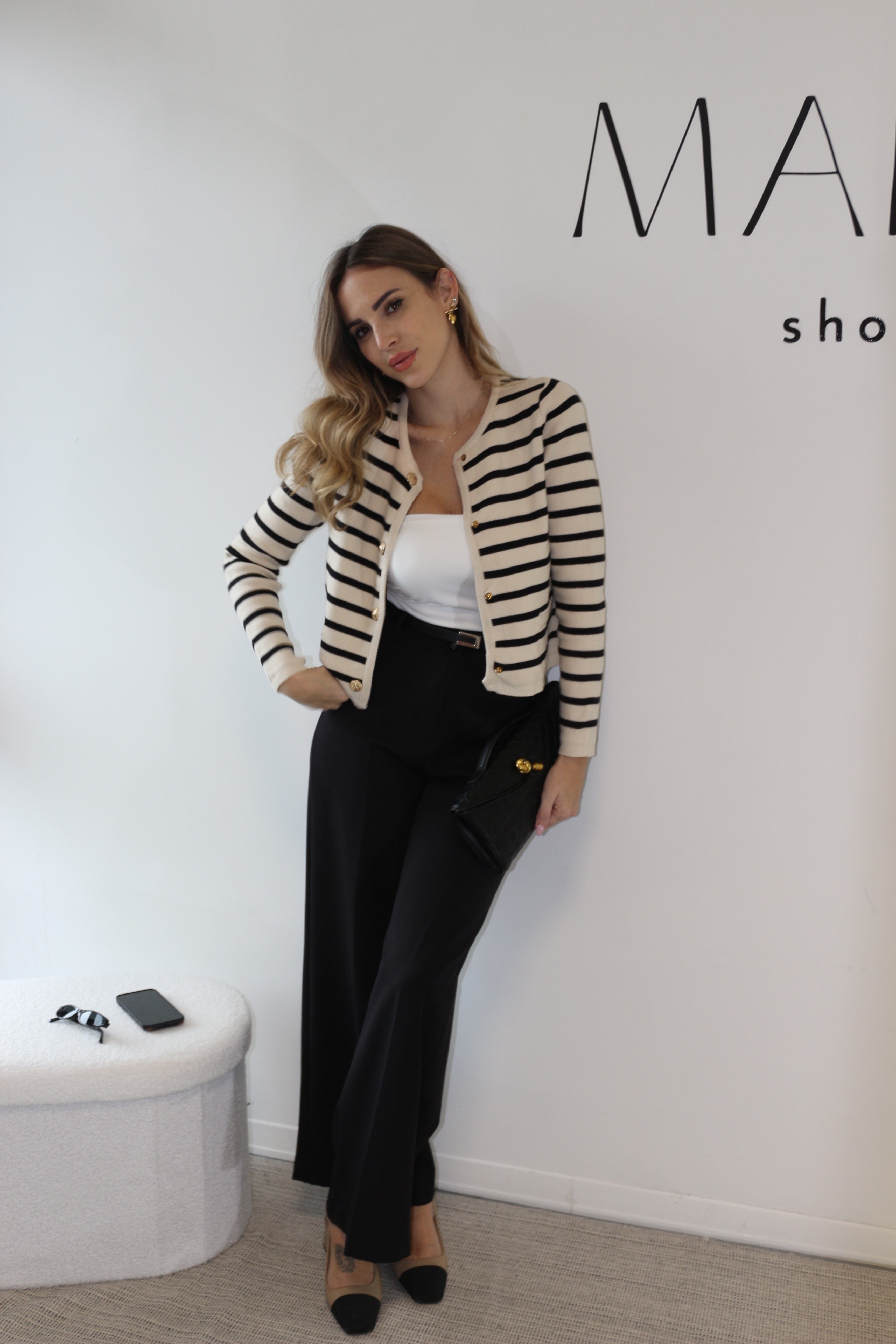 Un capo senza tempo che unisce eleganza e versatilità. Il Cardigan Parisienne è realizzato in tessuto morbido e caldo, con un raffinato motivo a righe nere su base beige, impreziosito da bottoni dorati che donano un tocco chic. Il taglio dritto e minimal lo rende perfetto per ogni occasione: indossalo aperto sopra una canotta per un look casual, oppure abbottonato per un outfit più sofisticato.