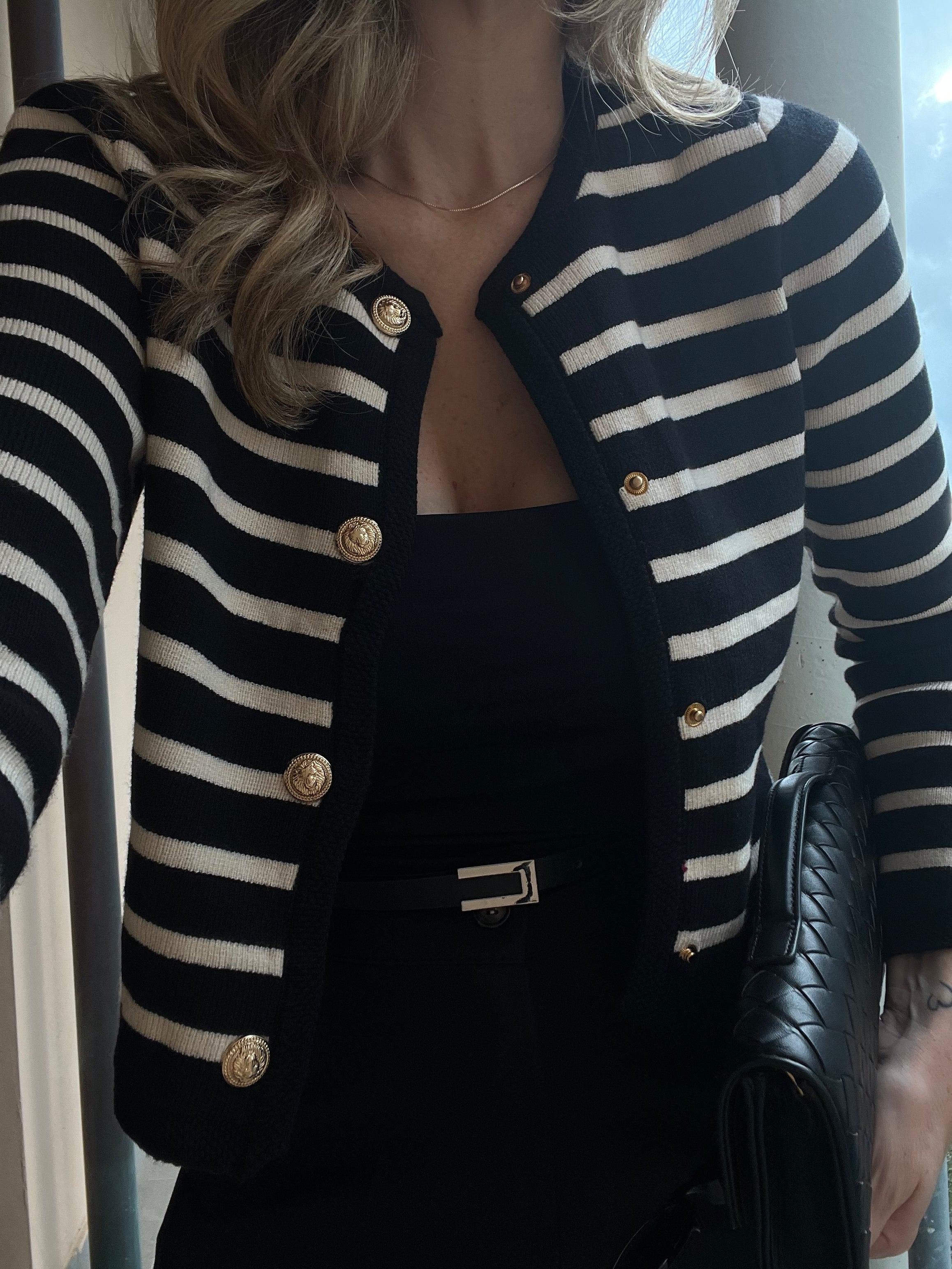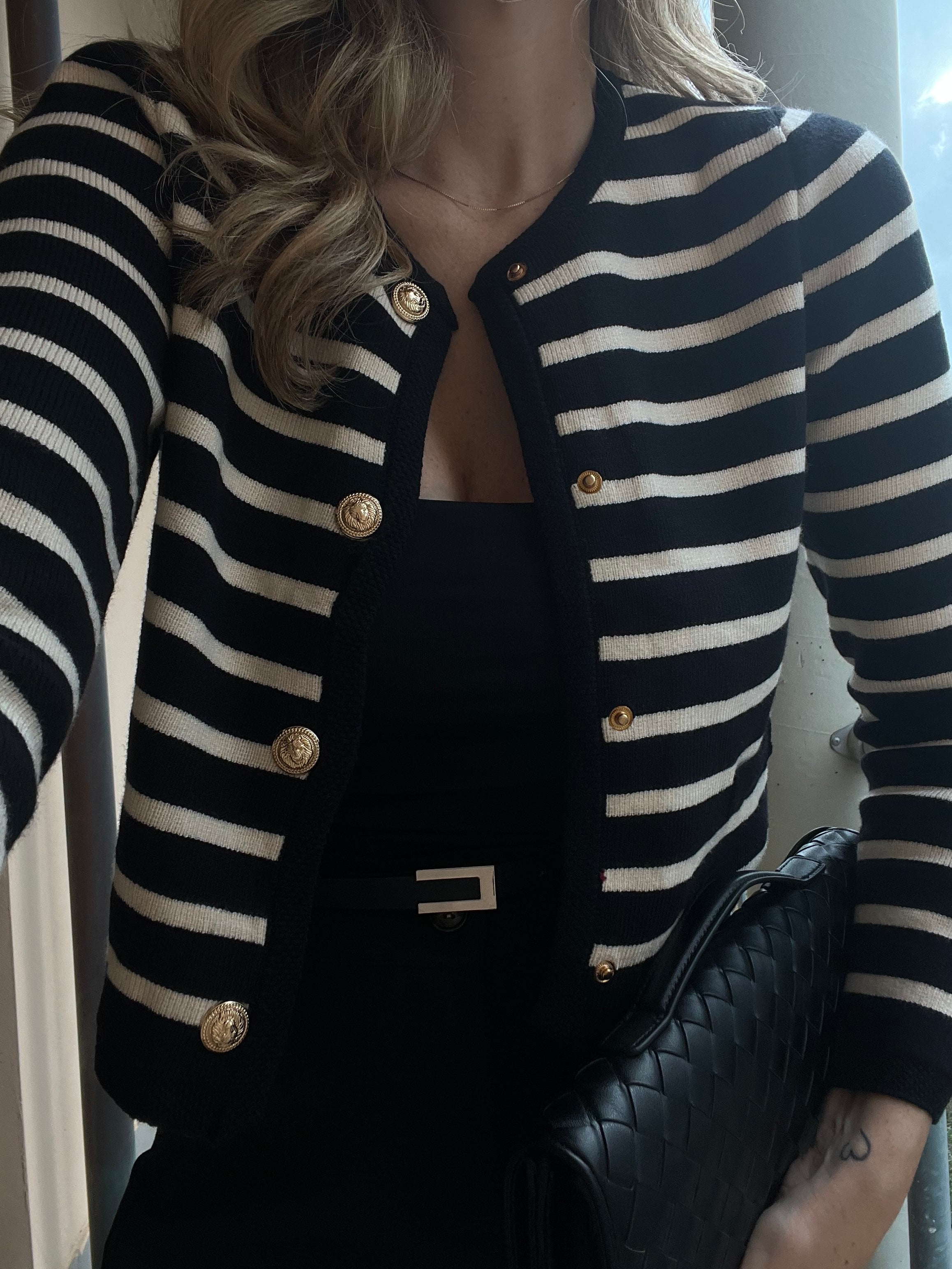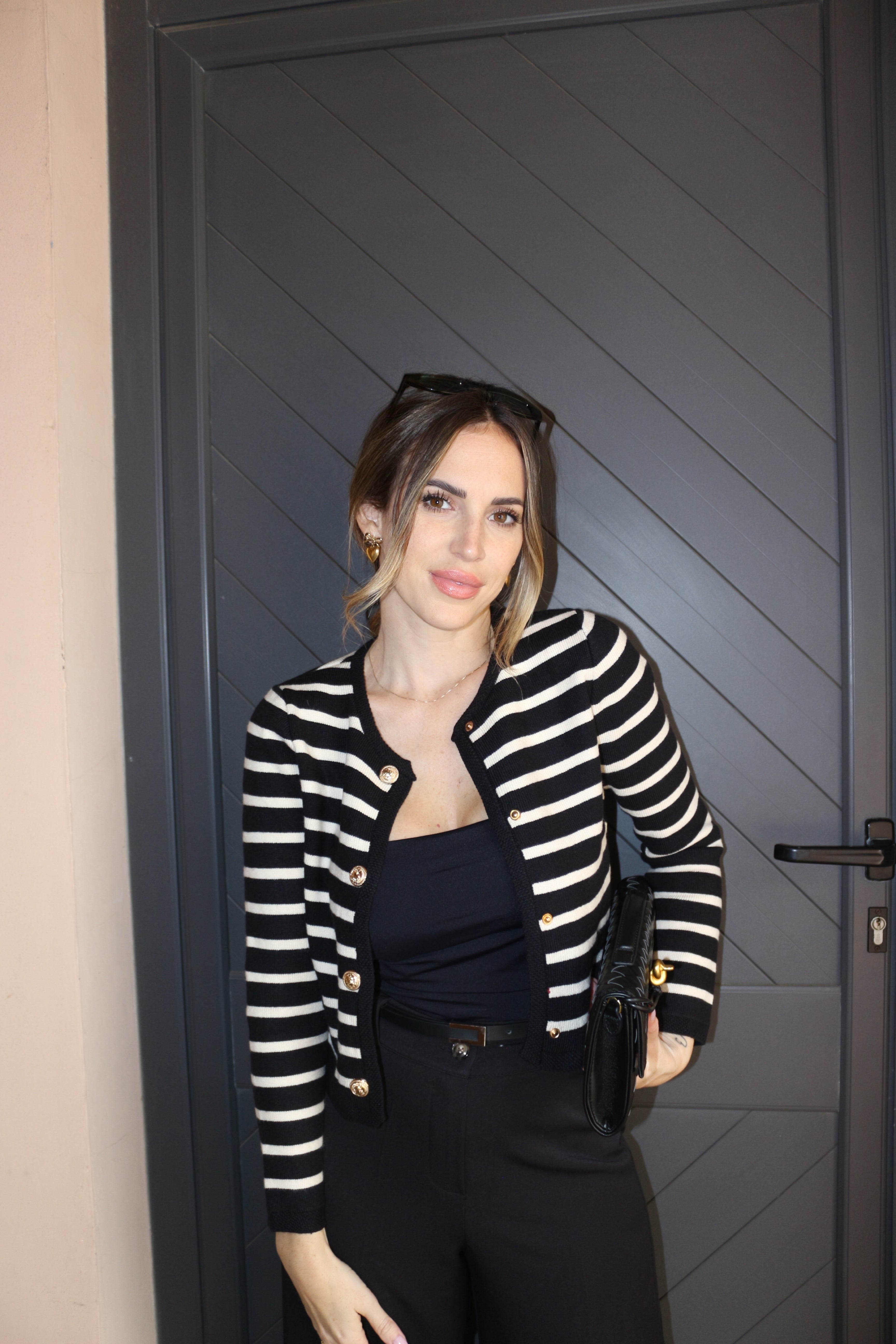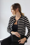 Il Cardigan Riviera Noir è l’emblema dell’eleganza senza tempo. Caratterizzato da righe bianche su fondo nero e impreziosito da bottoni dorati, questo capo unisce il fascino classico allo stile moderno. Il taglio femminile e la vestibilità comoda lo rendono ideale sia per look casual chic che per outfit più raffinati.