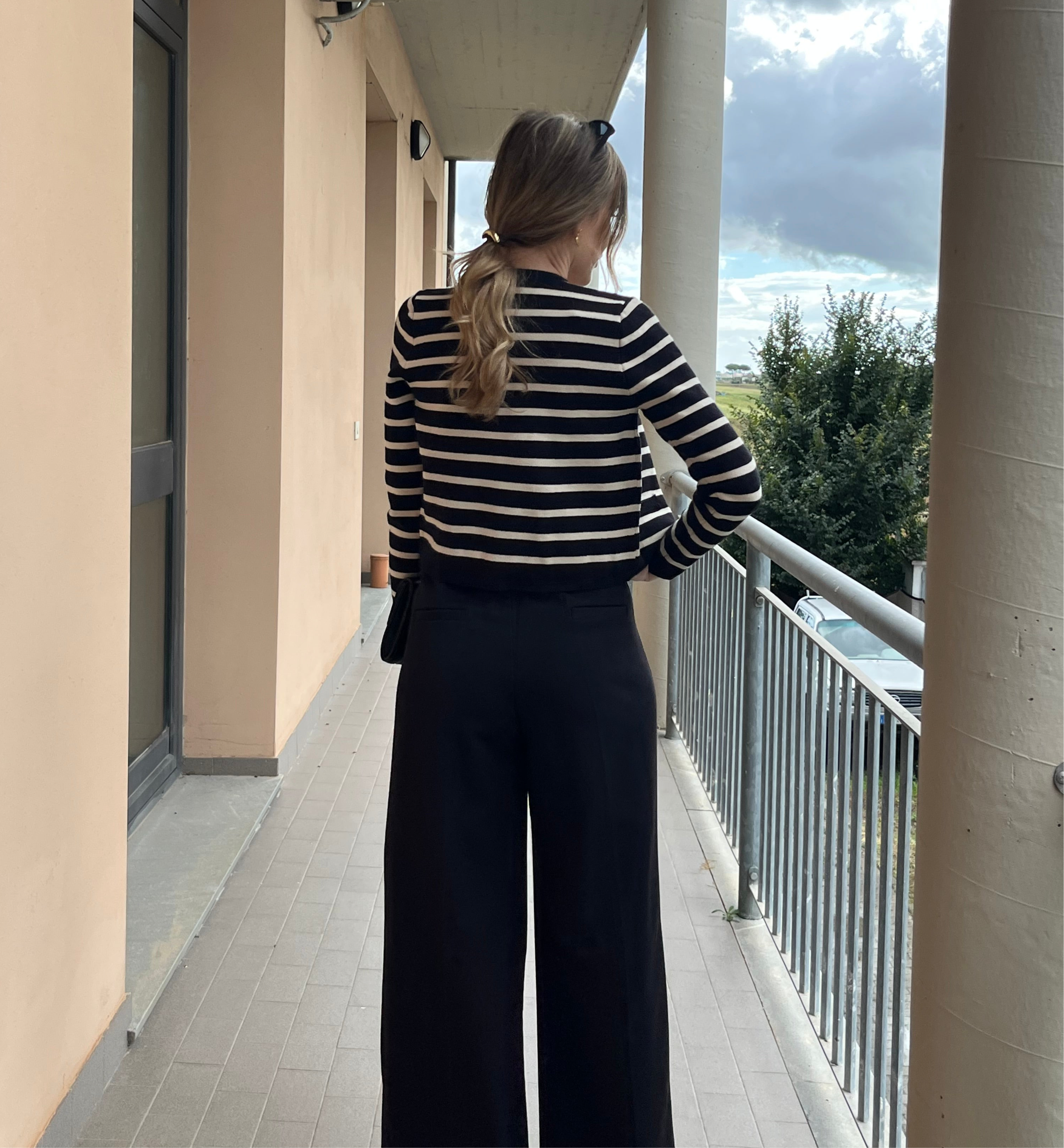 “Pantalone wide leg: comodissimo in vita e gamba che cade dritta. Su di me è leggermente lungo ma con le sneakers platform è perfetto.”