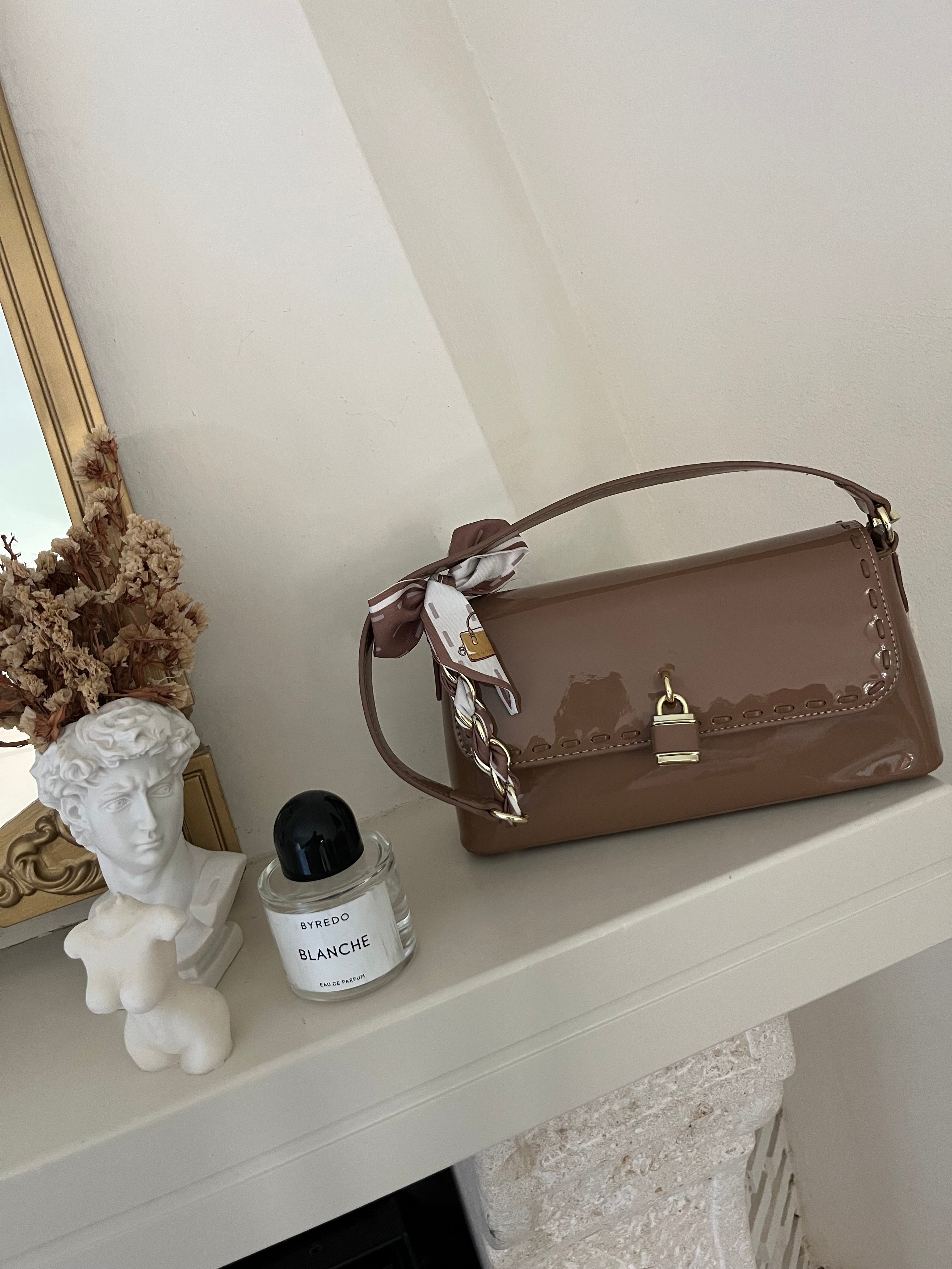 Borsa rigida strutturata con dettaglio catena e foulard impreziosita da lucchetto .. doppia cerniera interna.