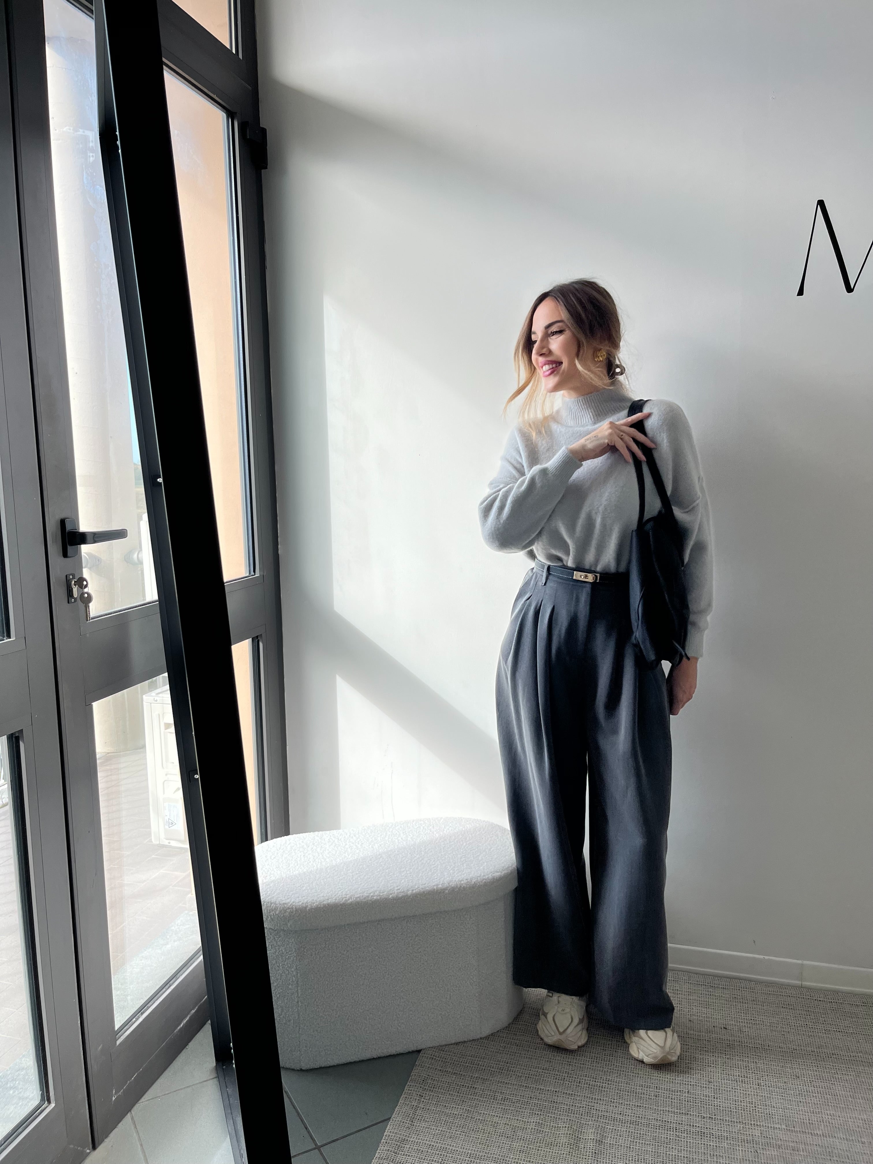 “Pantalone wide leg: comodissimo in vita e gamba che cade dritta. Su di me è leggermente lungo ma con le sneakers platform è perfetto.”