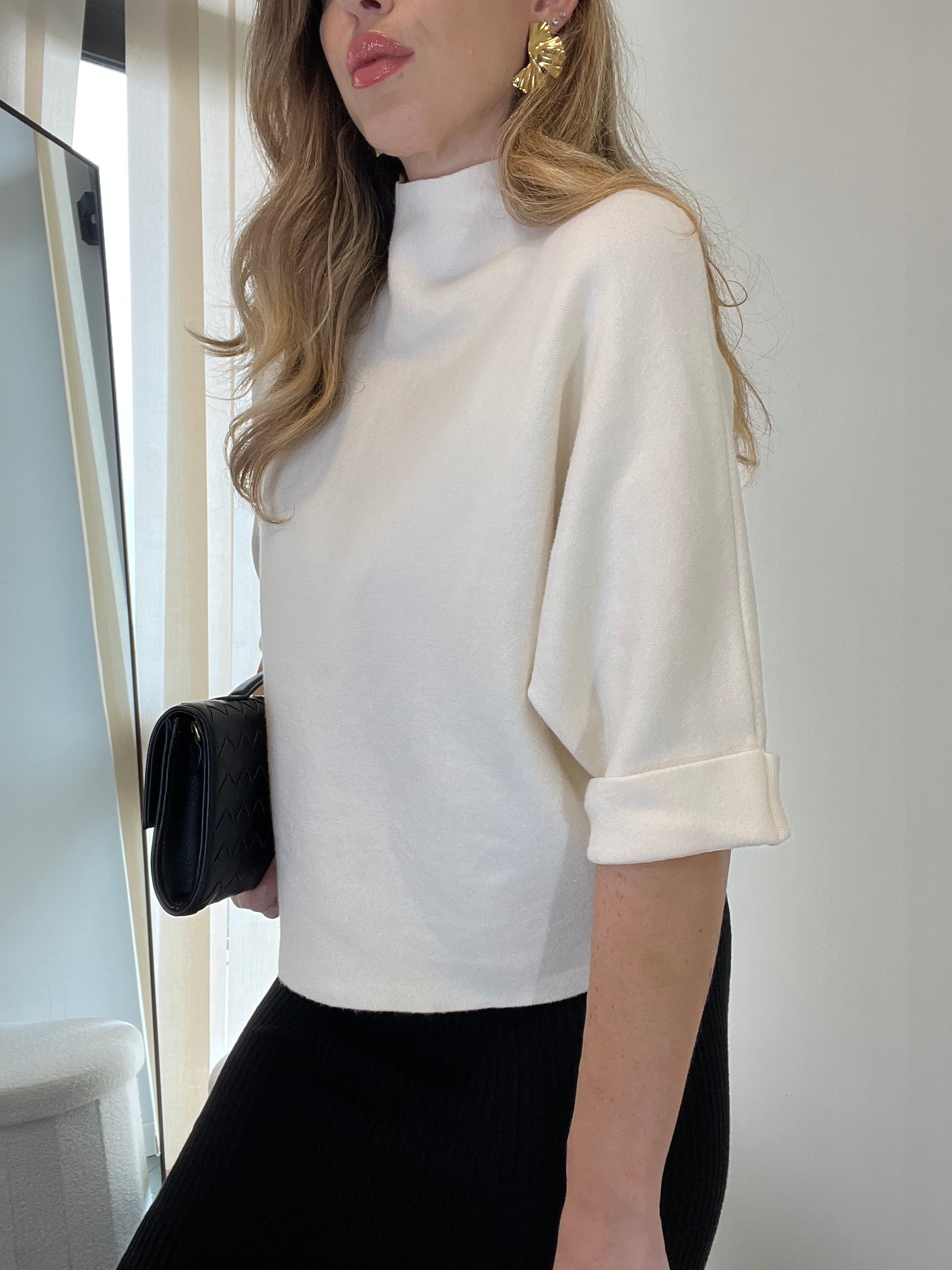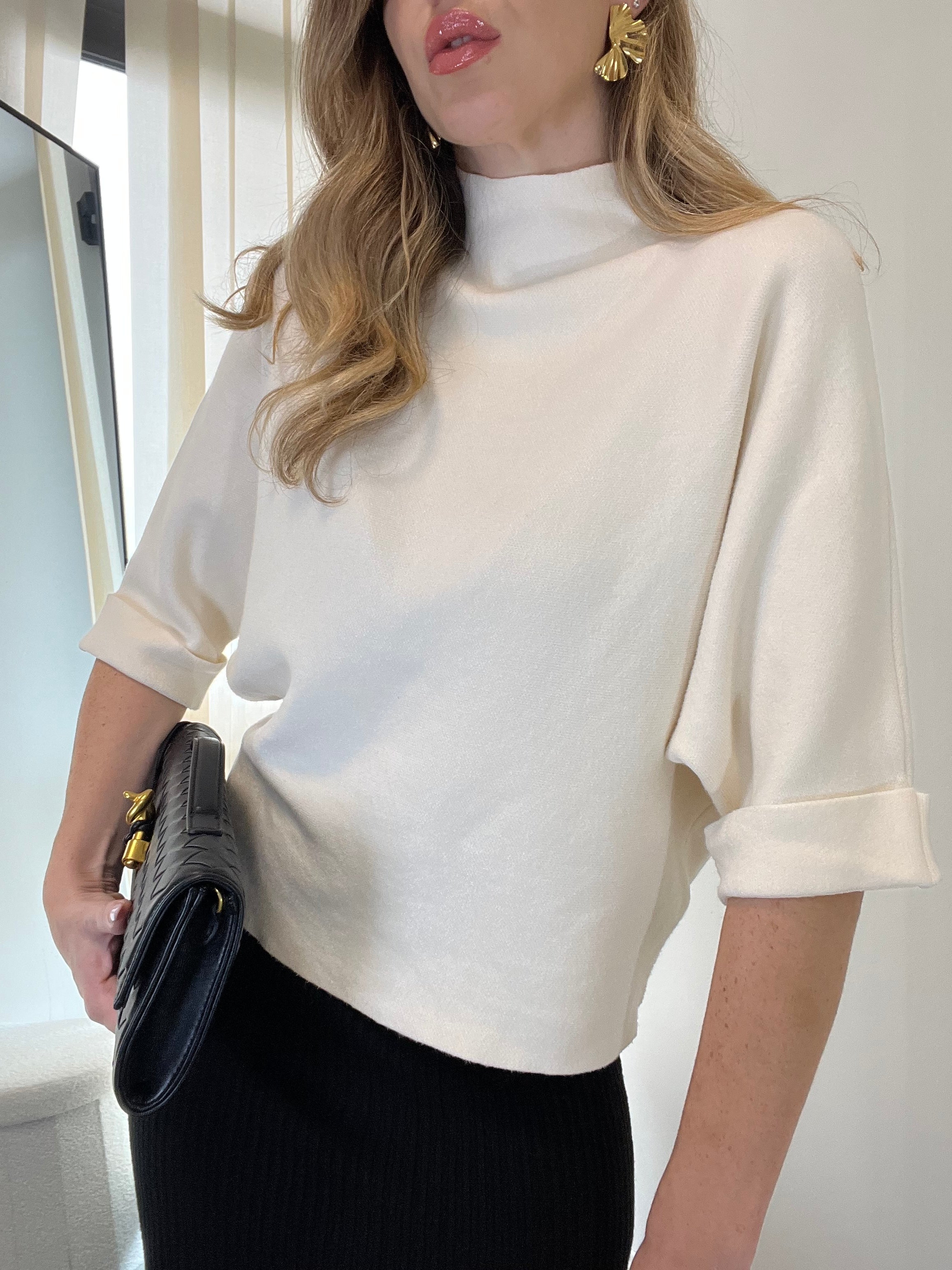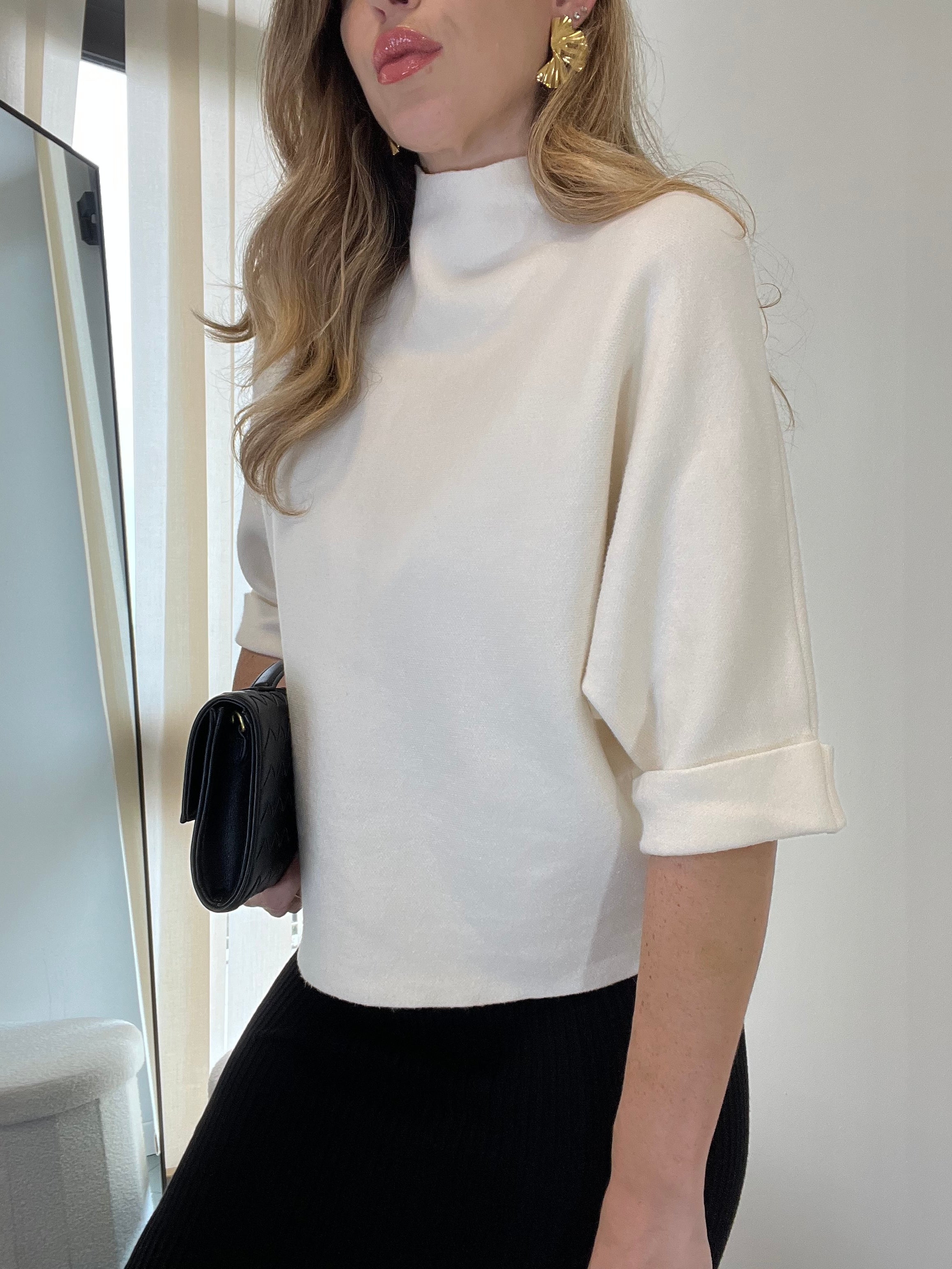 Il leggero collo a dolcevita dona un tocco sofisticato senza appesantire, mentre le maniche tre quarti lo rendono ideale per la mezza stagione e perfetto da indossare sia da solo che sotto giacche e trench.