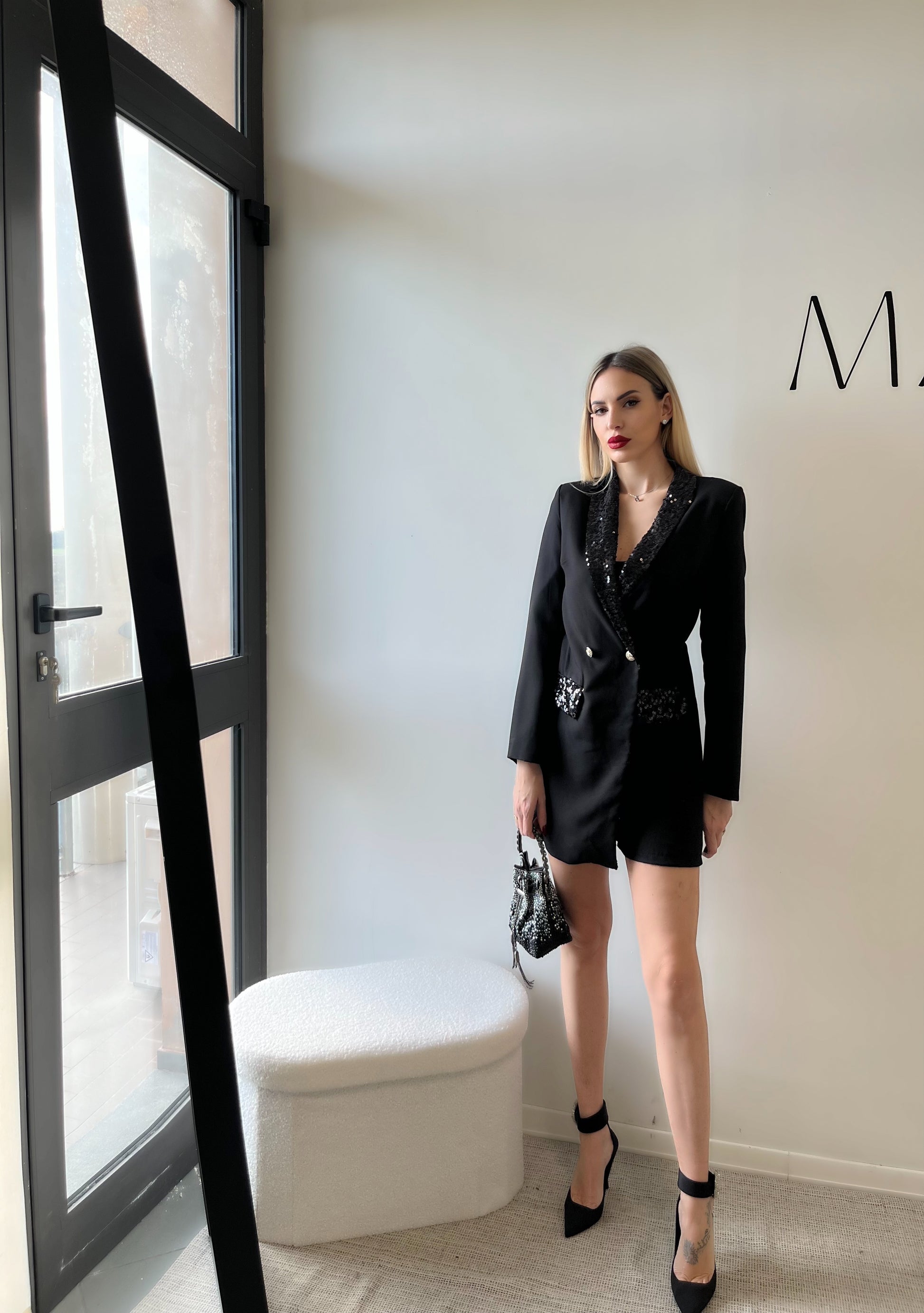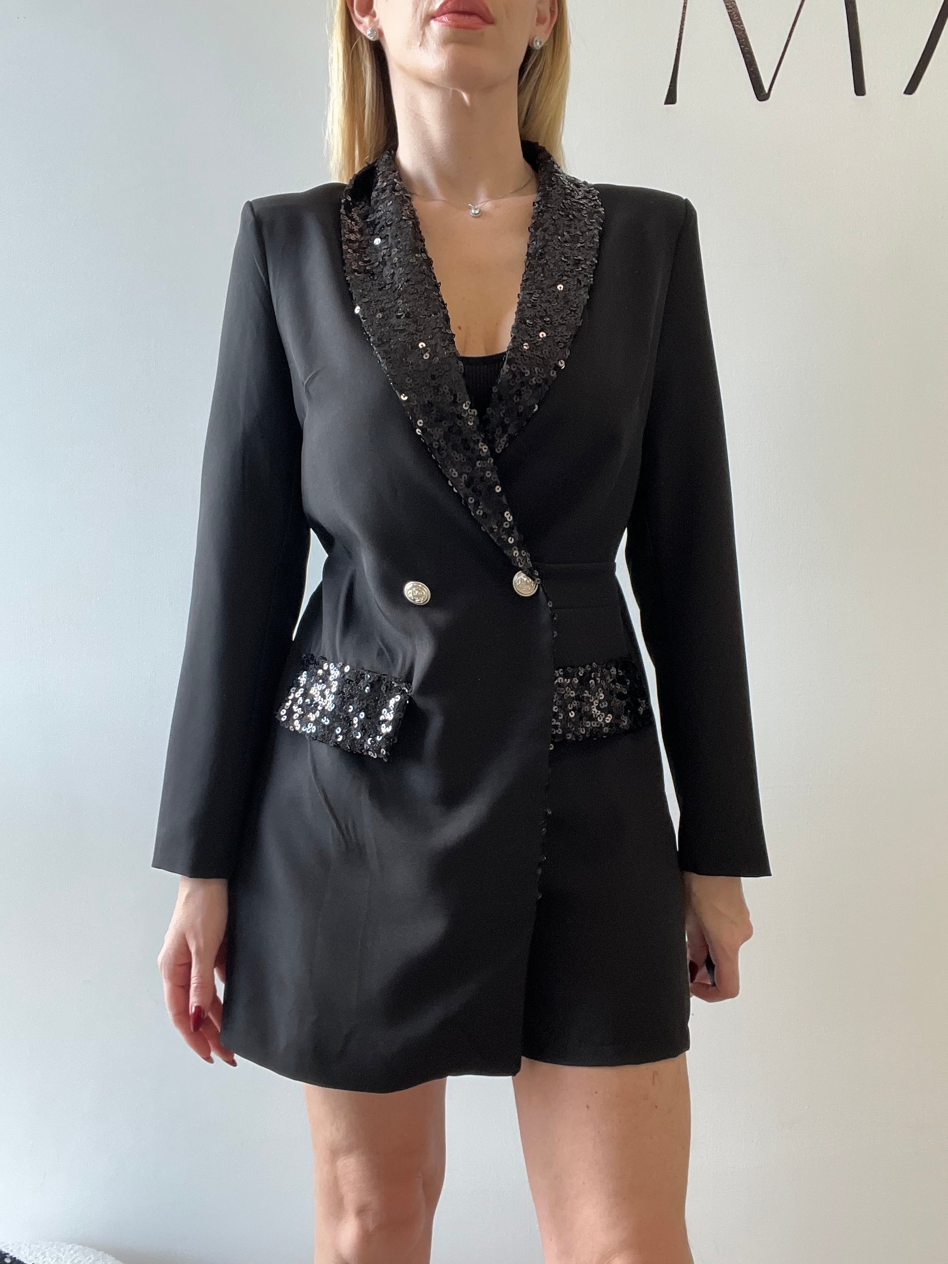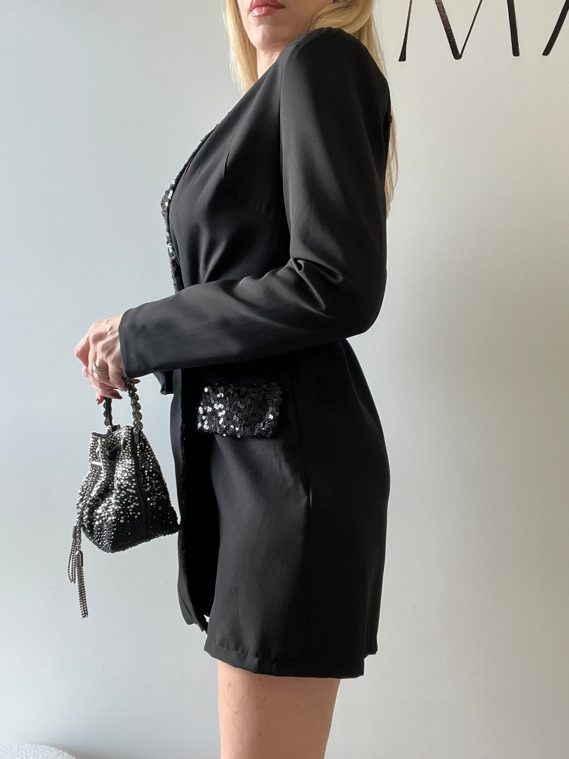 Abito giacca con pantaloncino interno, dettaglio profilo. In paillettes bottone ricamato.