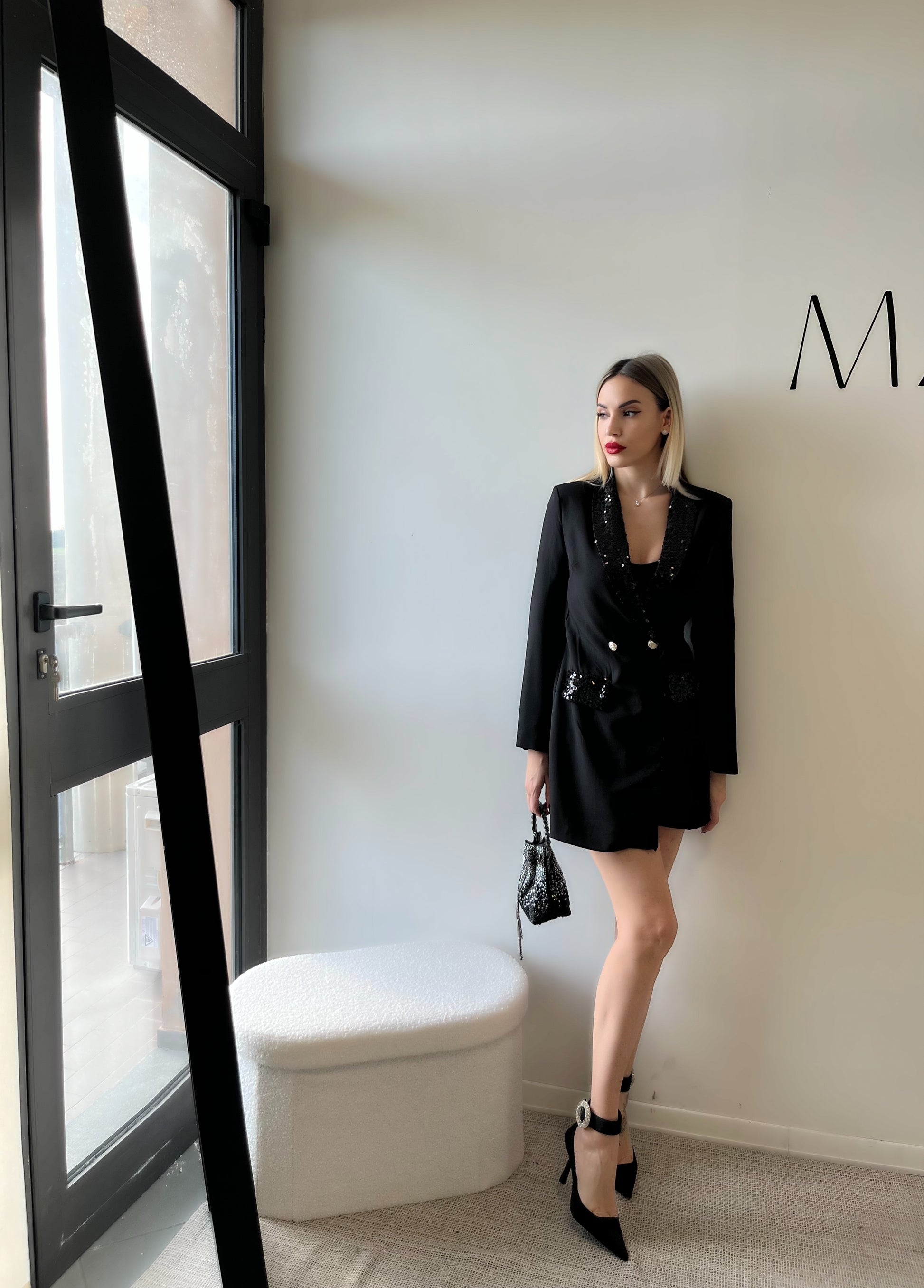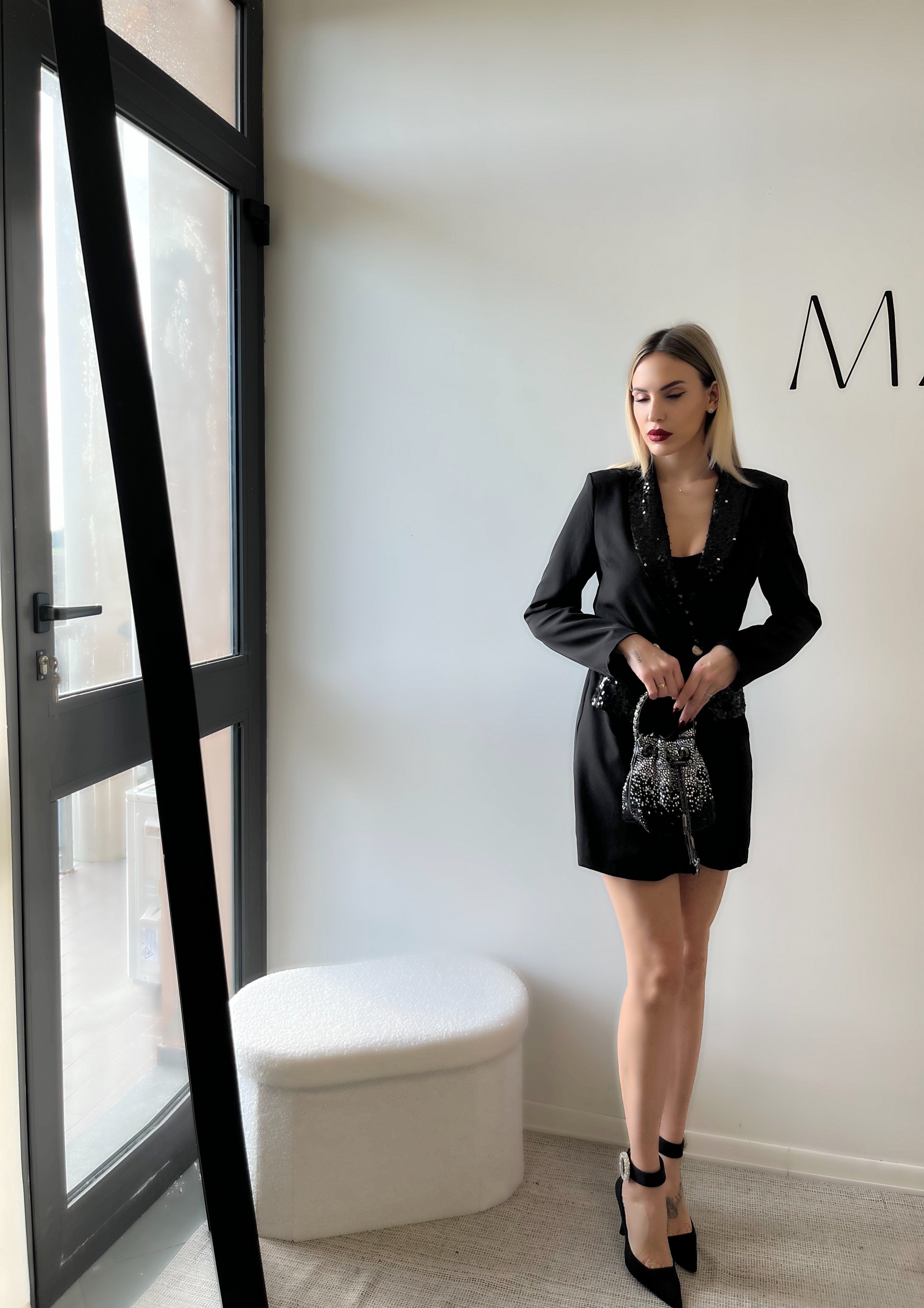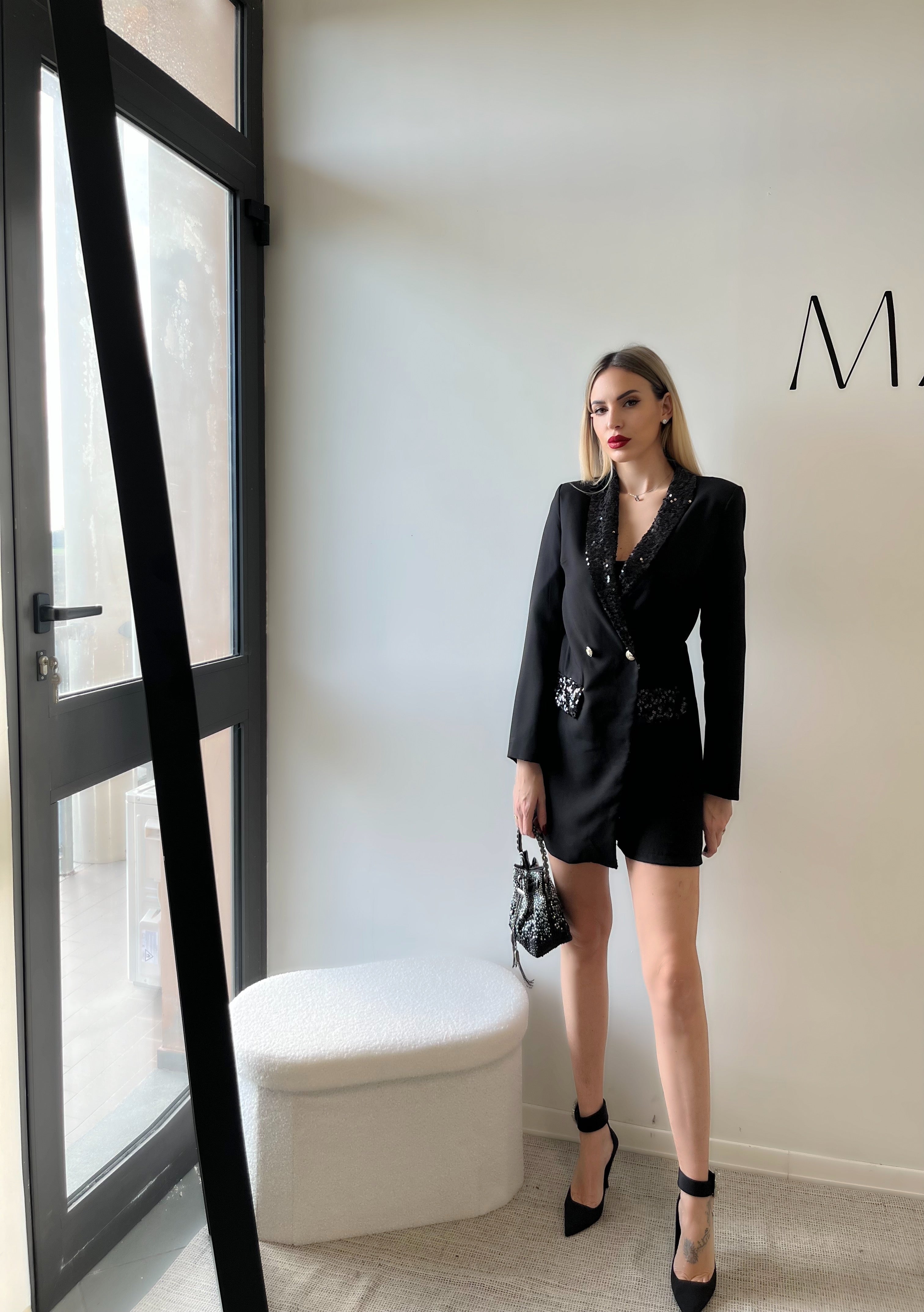 Abito giacca con pantaloncino interno, dettaglio profilo. In paillettes bottone ricamato.