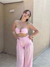 Coordinato composto da pantalone a palazzo vita alta elasticizzato in vita più top con dettaglio e fascia elasticizzata a nido d’ape sul retro.