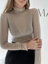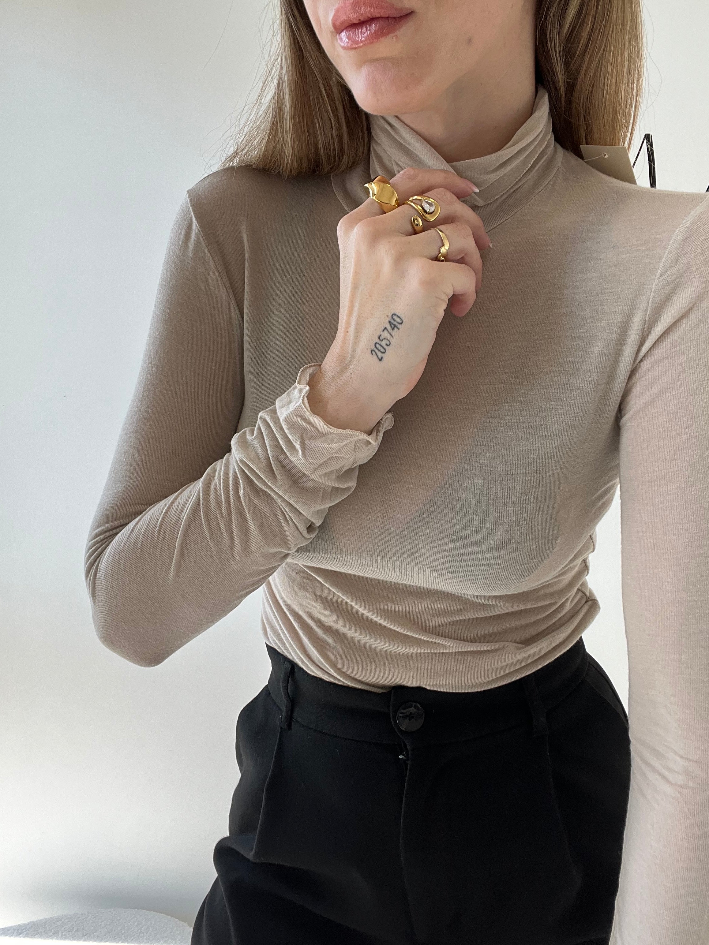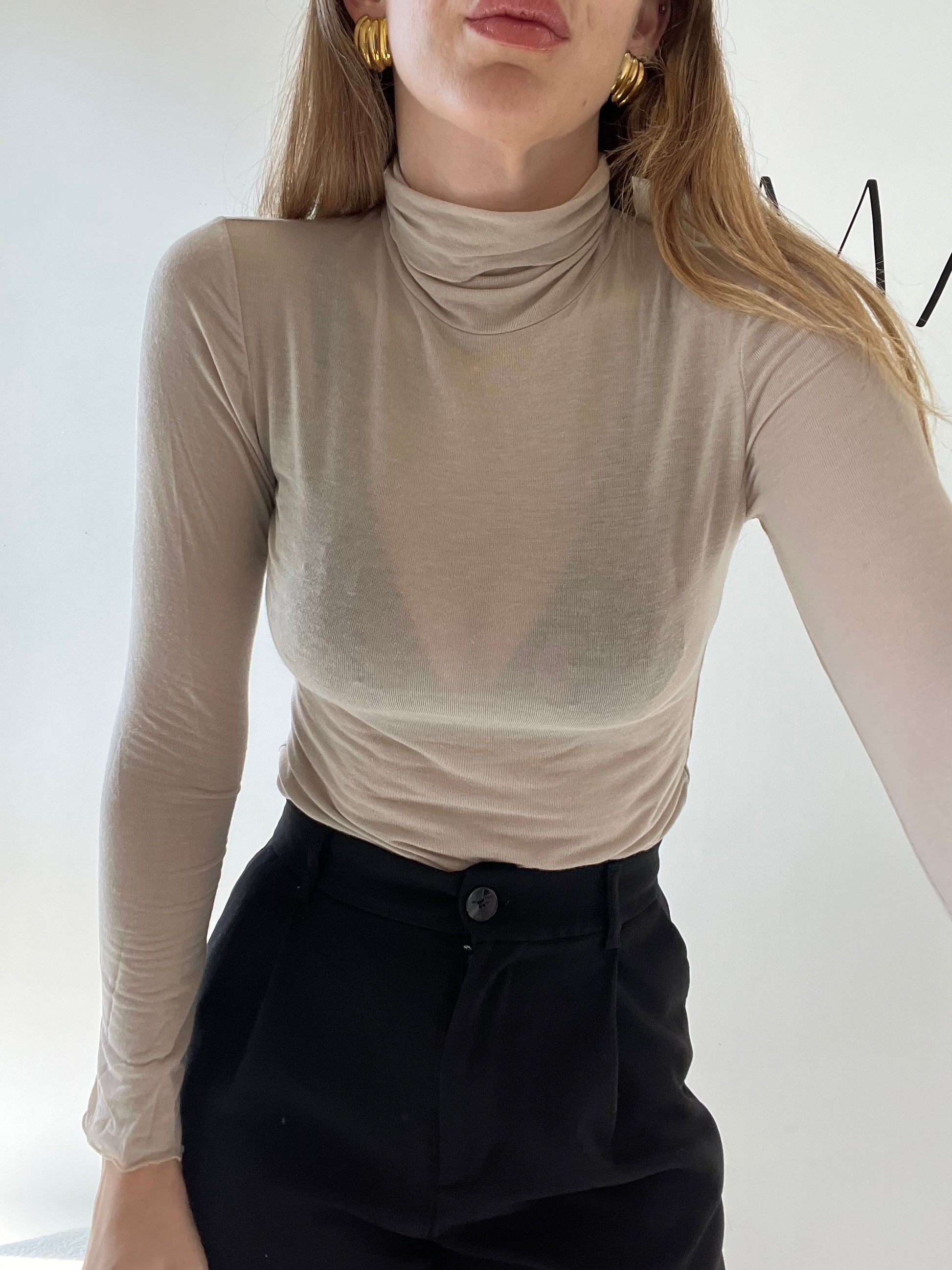 Un capo essenziale che unisce eleganza e sensualità con discrezione. Questo dolcevita in misto cashmere avvolge la silhouette con morbidezza, lasciando intravedere la pelle grazie alla sua delicata trasparenza.
