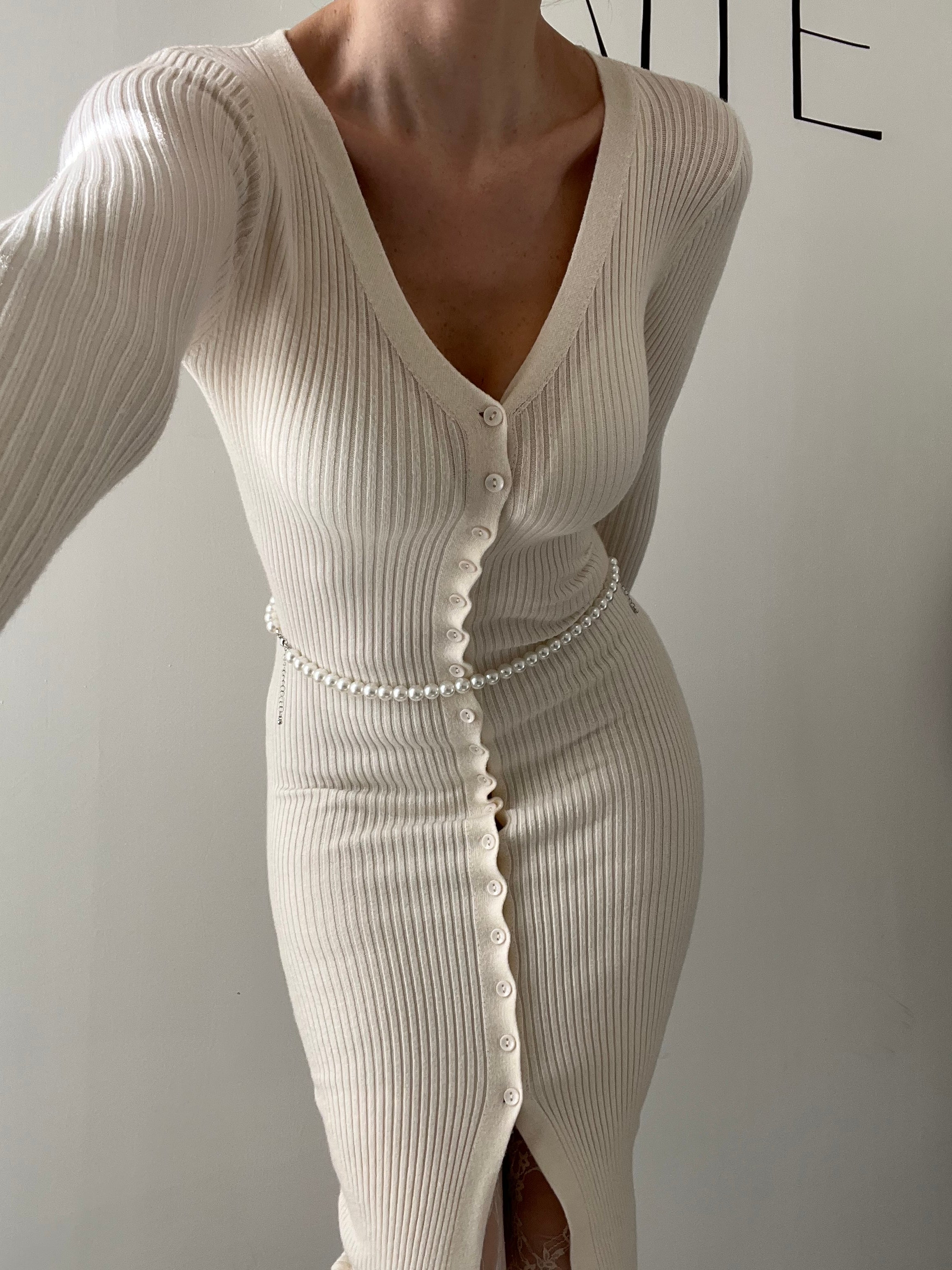 Abito lungo in maglia con bottoncini su tutta la lunghezza , questo permette di aprire lo spacco come poi desiderate.