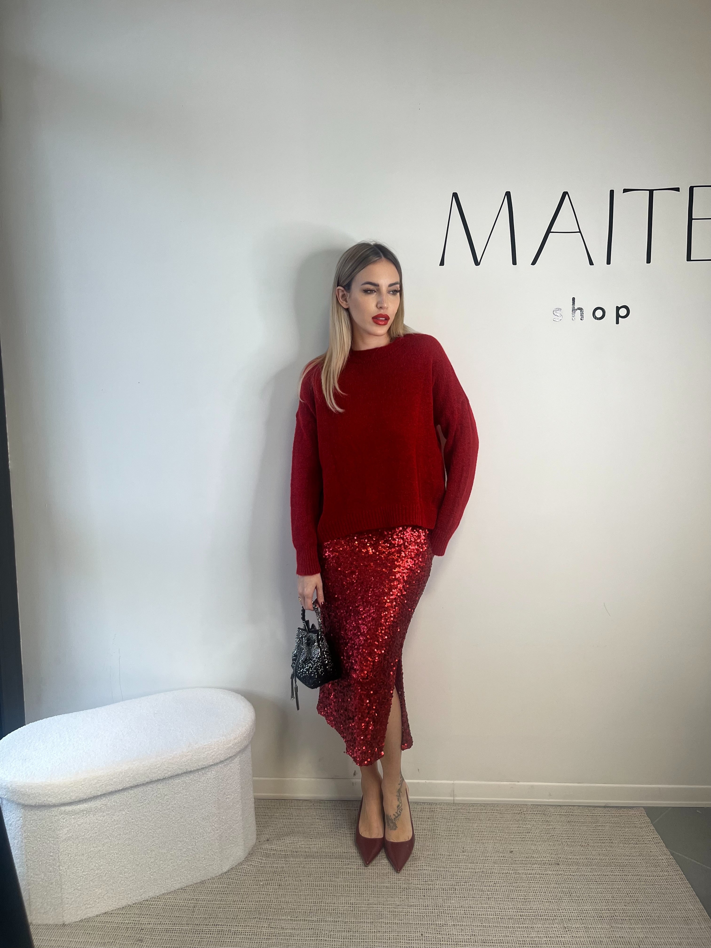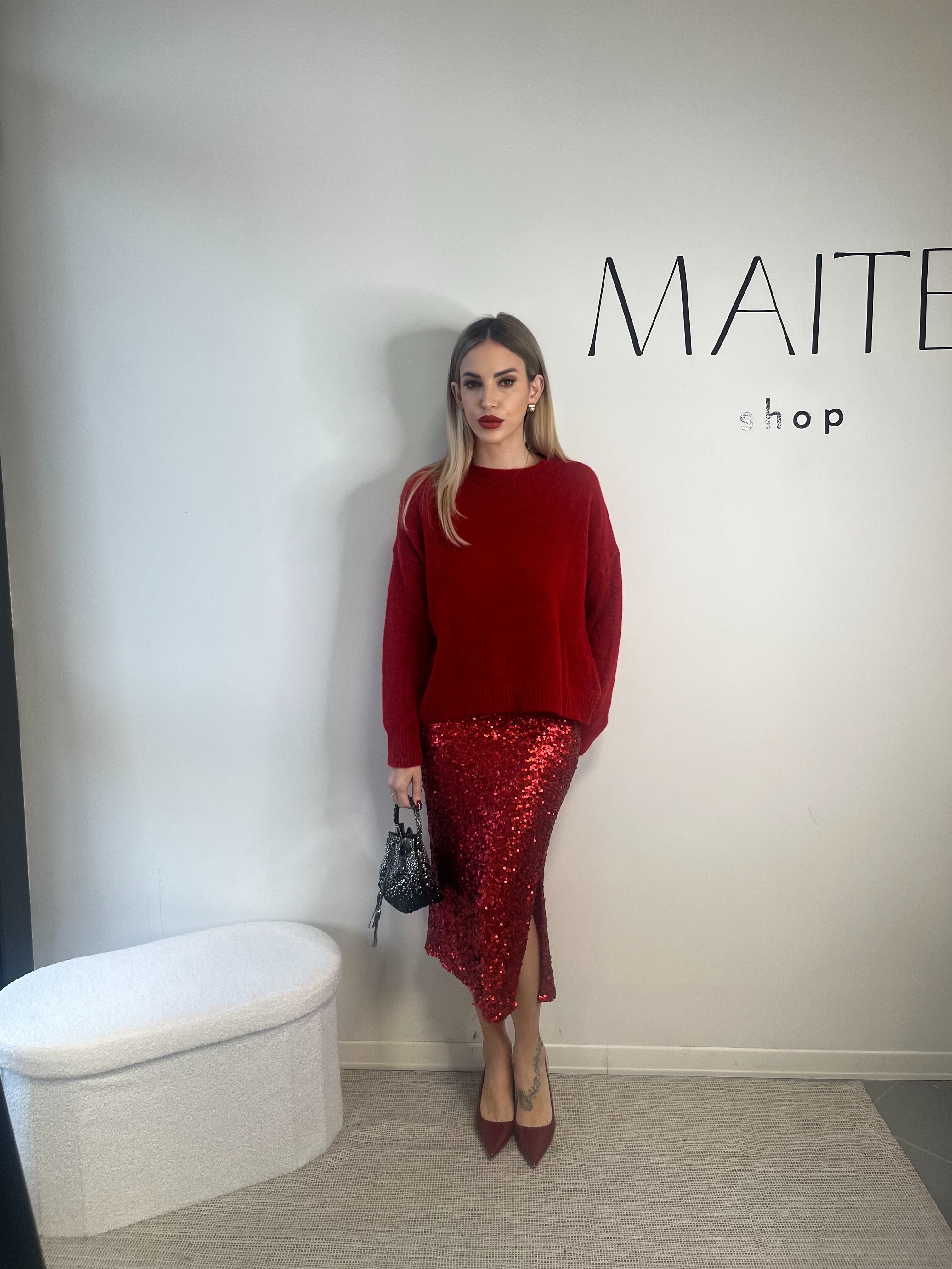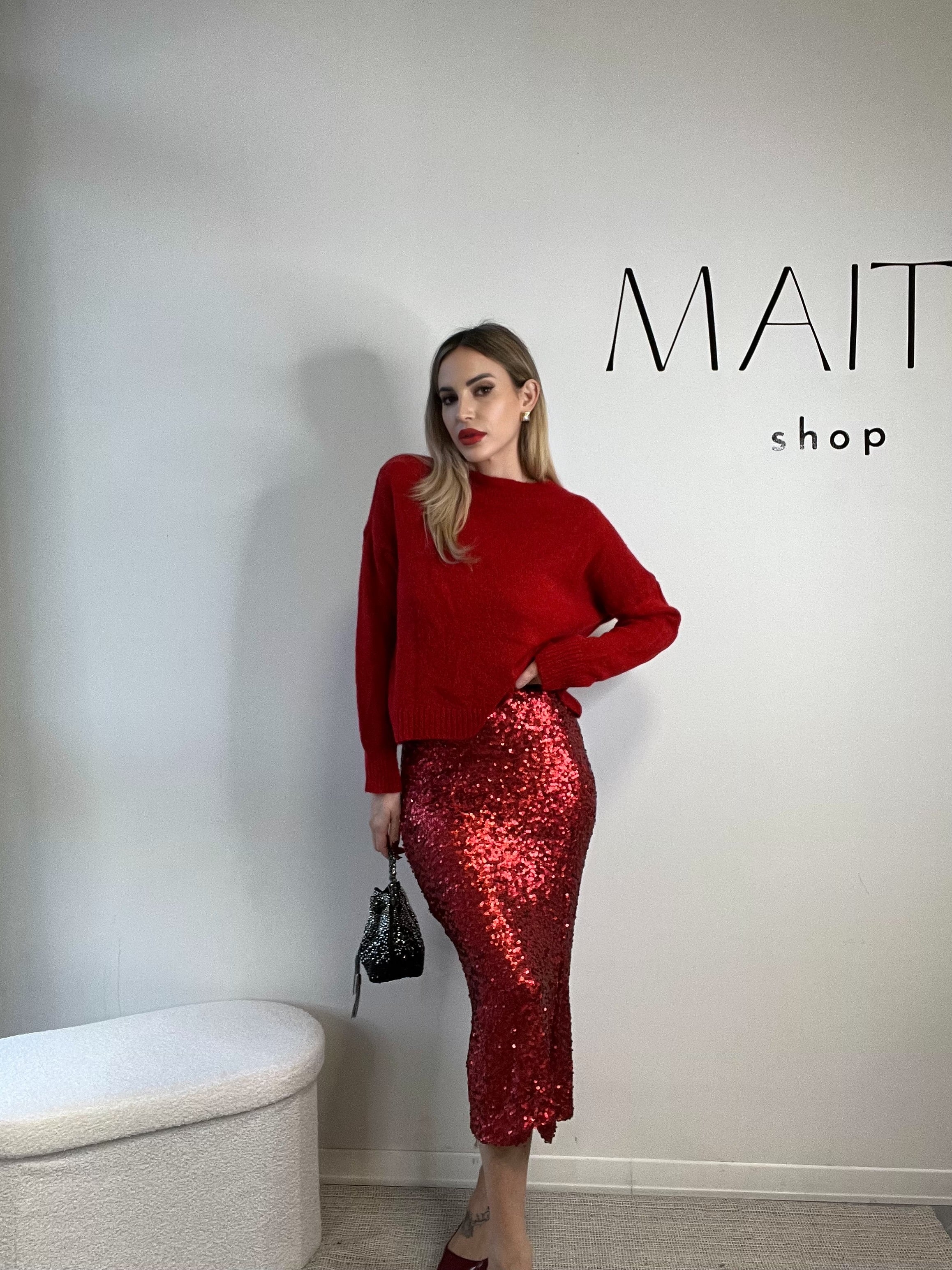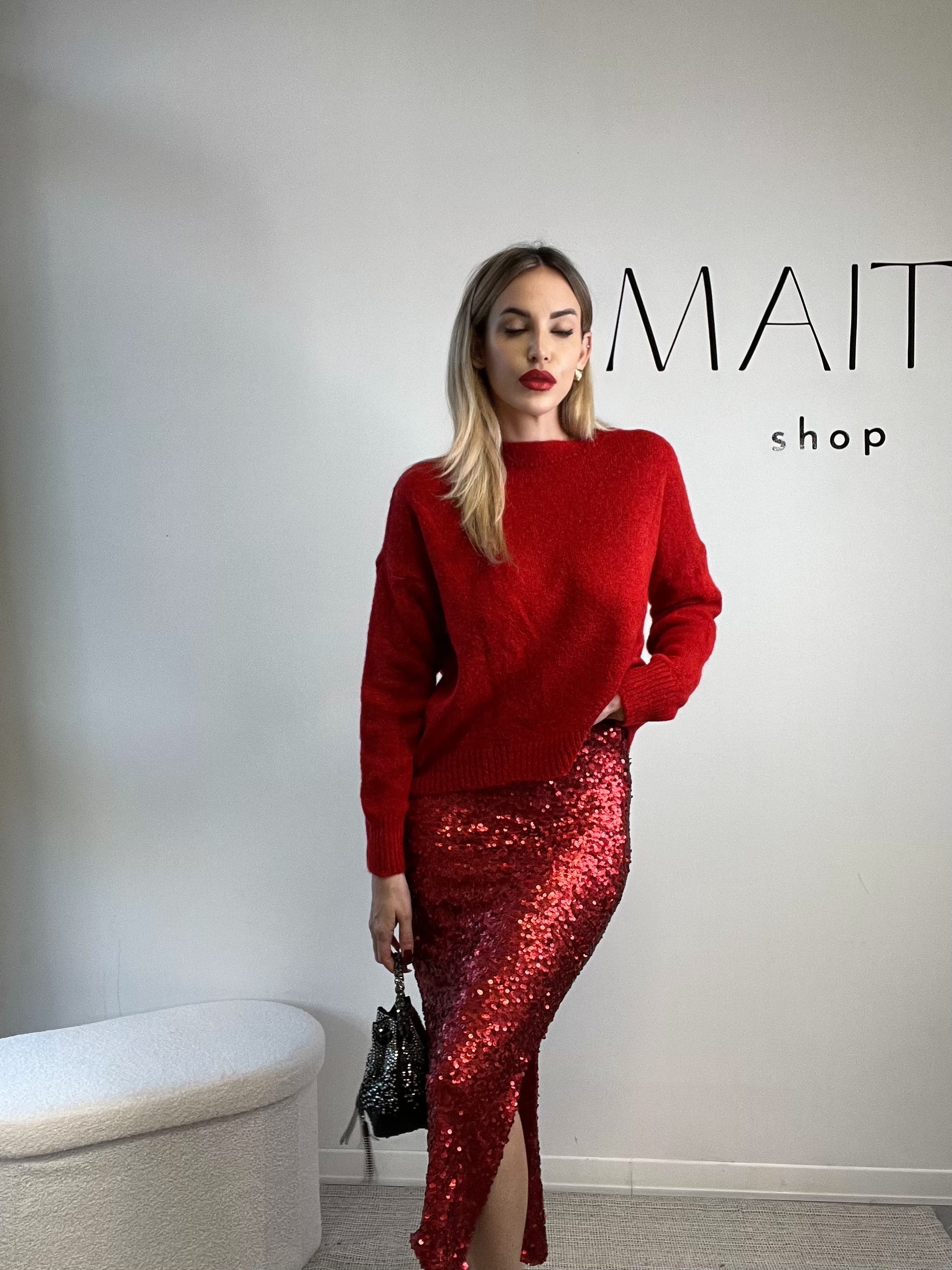 Gonna midi di paillettes rosso intenso con sottogonna in cotone. Elastico in vita
