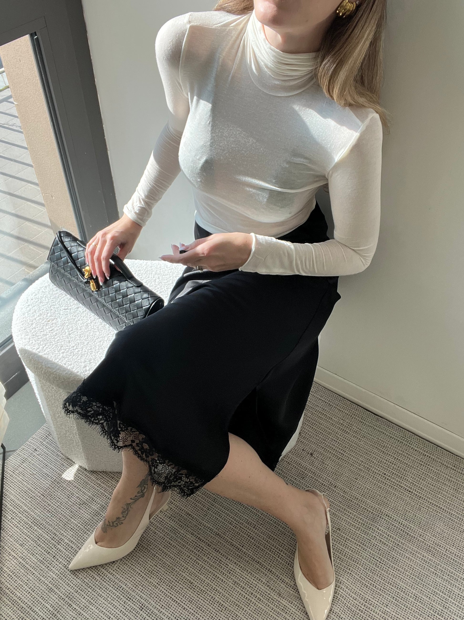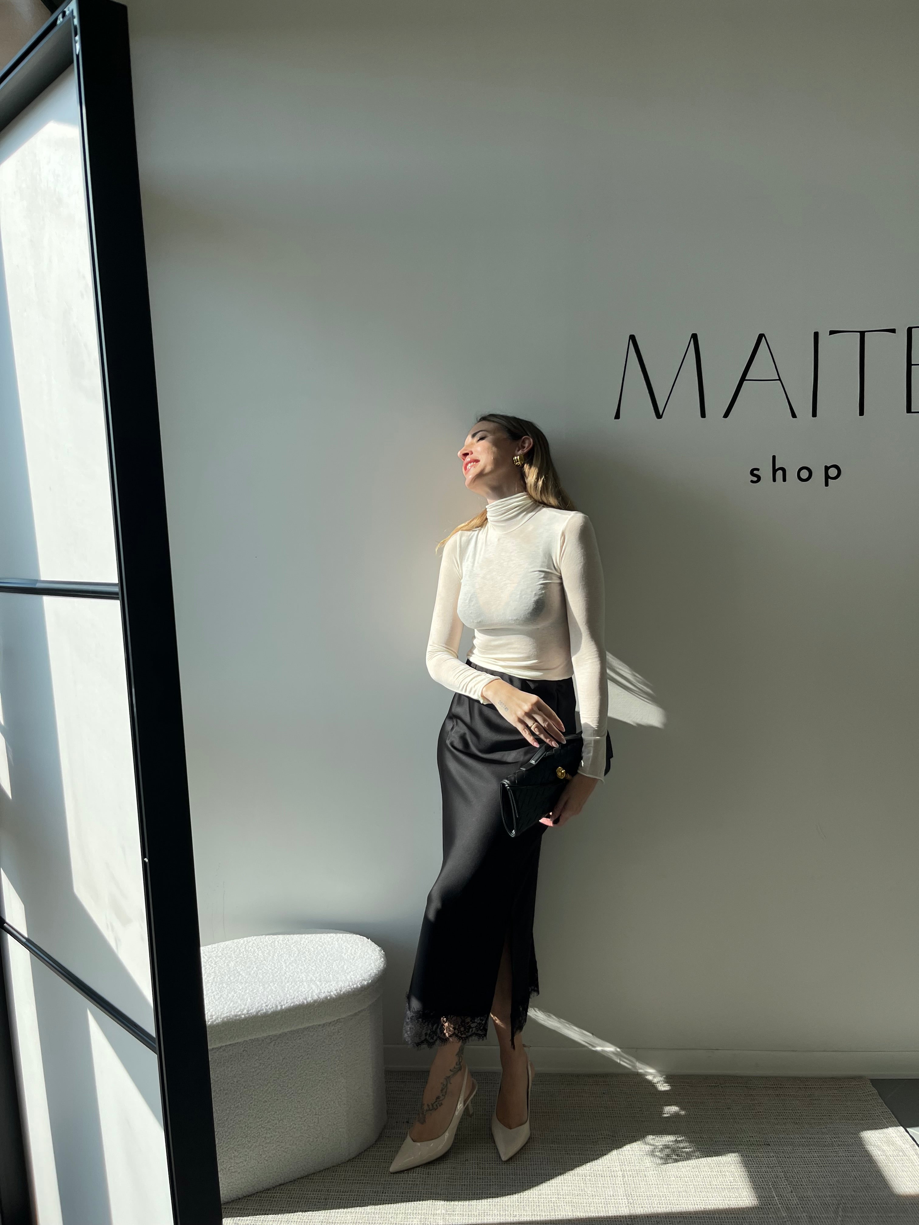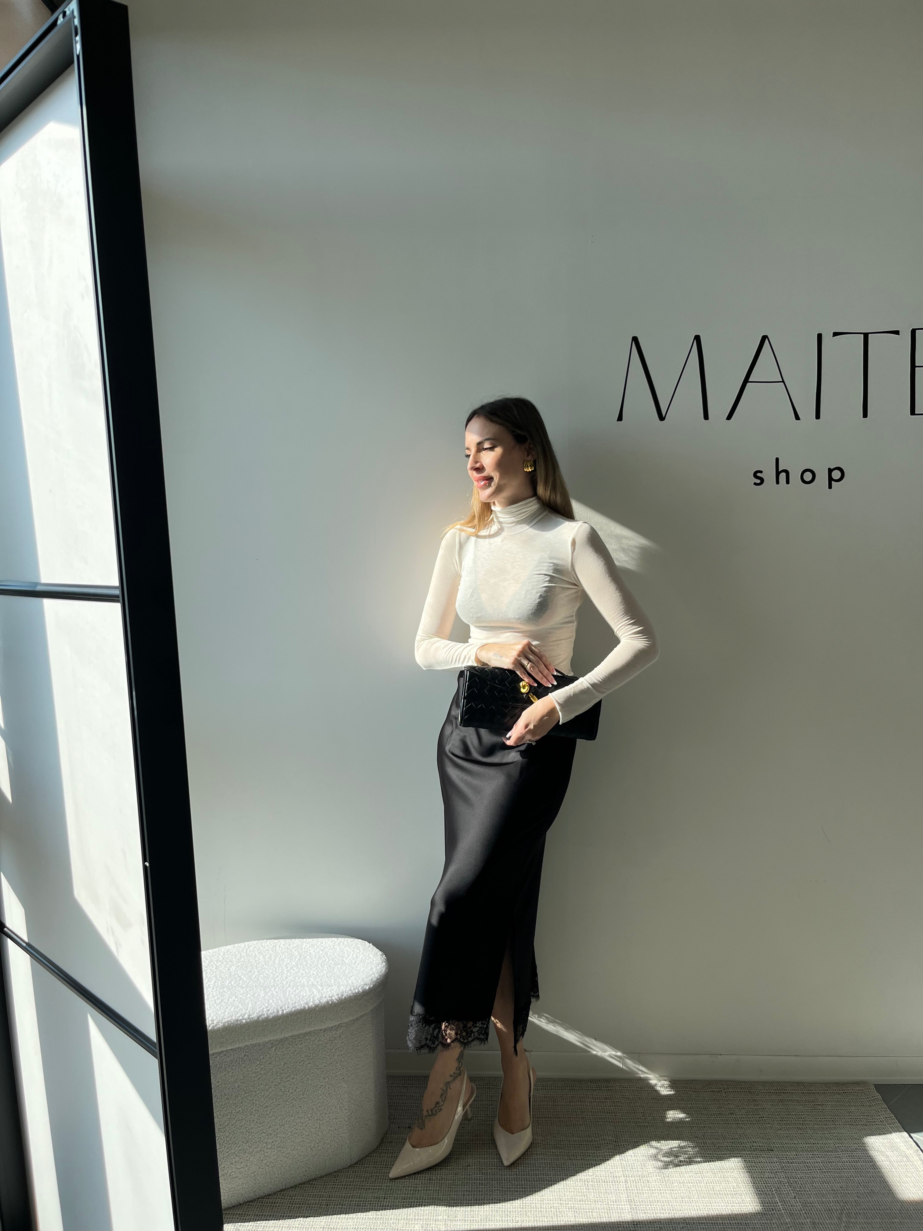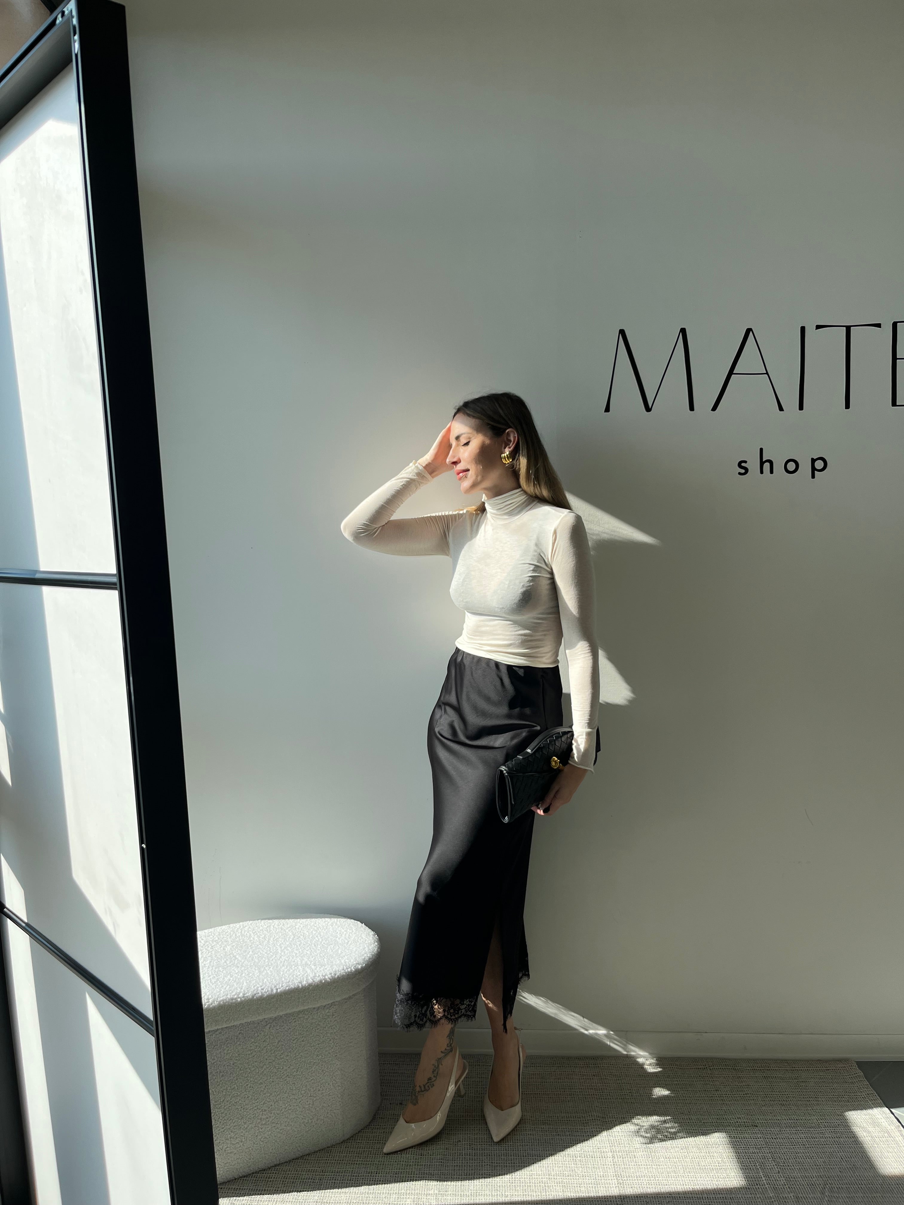 Questa gonna lunga in raso nero scivola delicatamente sulle forme, regalando una lucentezza sofisticata ad ogni movimento. L’elastico in vita assicura una vestibilità comoda e versatile, adatta fino alla taglia M, mentre il delicato bordo in pizzo aggiunge un tocco di sensualità discreta e raffinata.