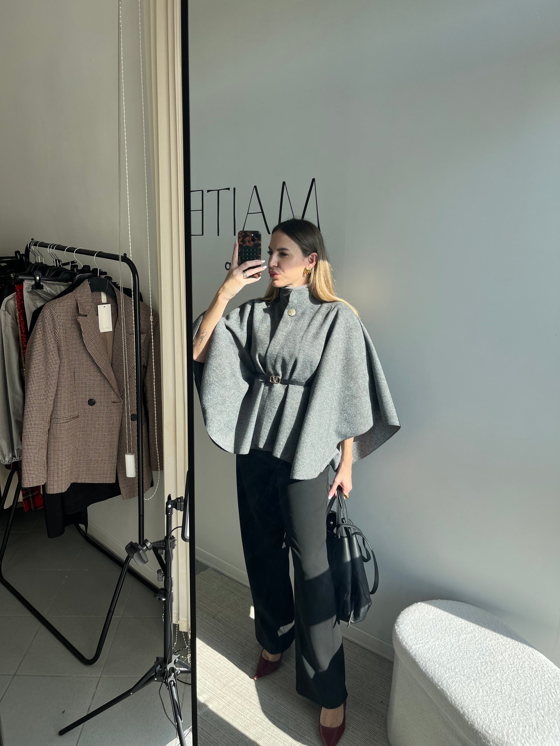 • Tessuto: Realizzata in un pregiato tessuto tweed con un'armatura a spina di pesce che dona profondità e texture al colore grigio. Il tessuto è strutturato per mantenere la forma ampia ed elegante.
