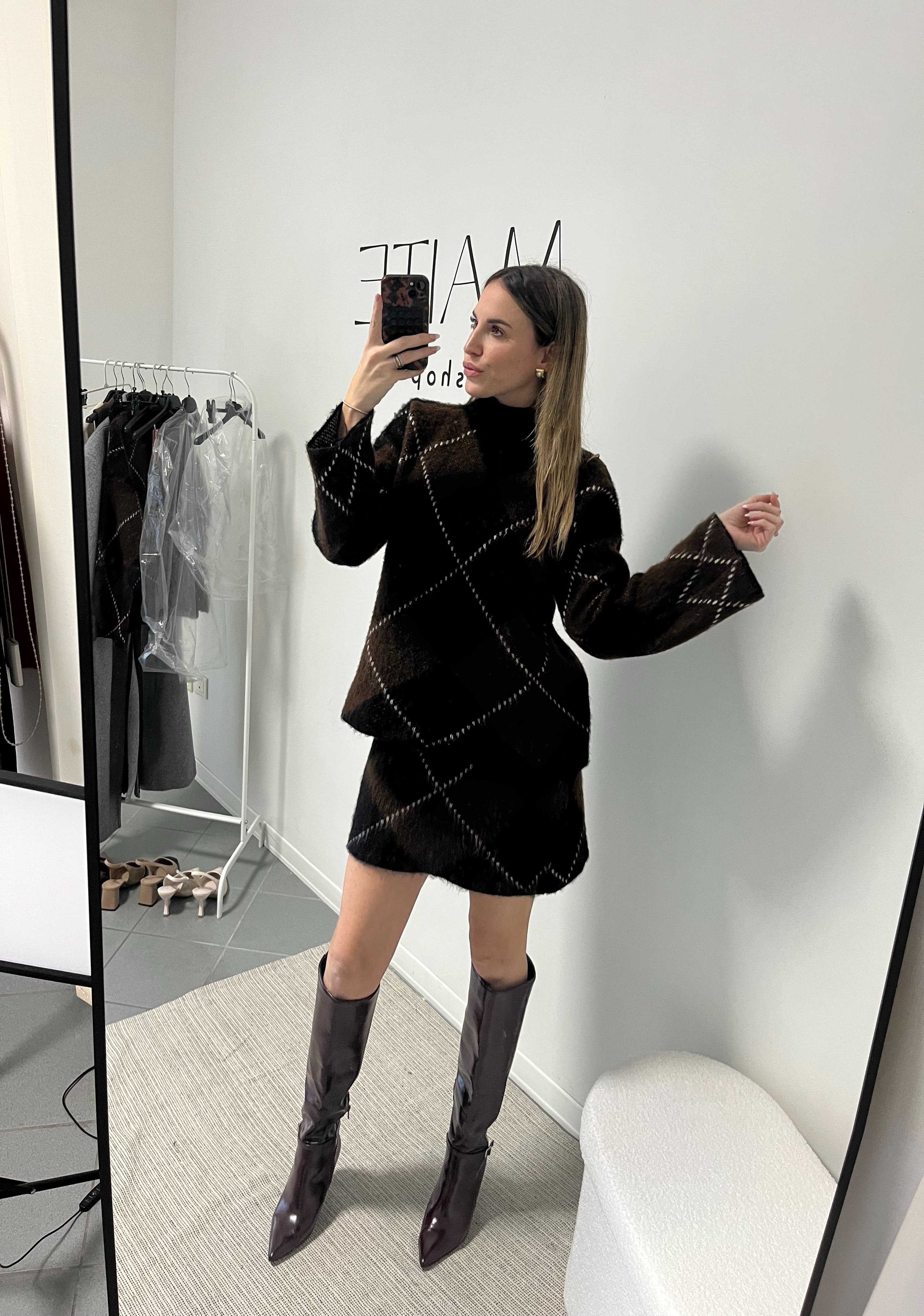 • Maglia: Morbido pullover a collo alto con maniche lunghe, caratterizzato dalla seducente fantasia Argyle (a rombi). La palette scura di marrone, nero è attraversata da sottili linee a contrasto che illuminano la trama. La lunghezza della gonna lo rende versatile per ogni occasione.