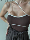Aggiungi un tocco sofisticato e trendy al tuo guardaroba con il top Cocoa Chic. Realizzato in morbido tessuto a costine color cioccolato con eleganti profili bianchi, questo top valorizza la silhouette con la sua linea aderente e femminile. Le sottili spalline incrociate sul collo aggiungono un dettaglio originale e sensuale, perfetto per le giornate estive o le serate casual chic. Abbinalo a una gonna morbida o a un jeans a vita alta per un look contemporaneo e senza sforzo.