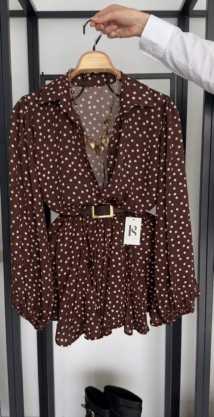 Modello taglia unica con vestibilità morbida, caratterizzato da colletto classico, scollo leggermente a V e maniche lunghe con polsino. La cintura inclusa in vita valorizza la silhouette, creando un effetto armonioso e raffinato. Un capo versatile, ideale da indossare sia di giorno che di sera.