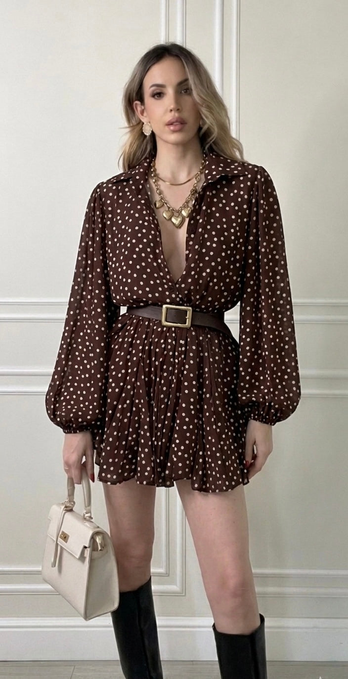 Abito corto in fantasia pois su base marrone, elegante e femminile, perfetto per ogni occasione.