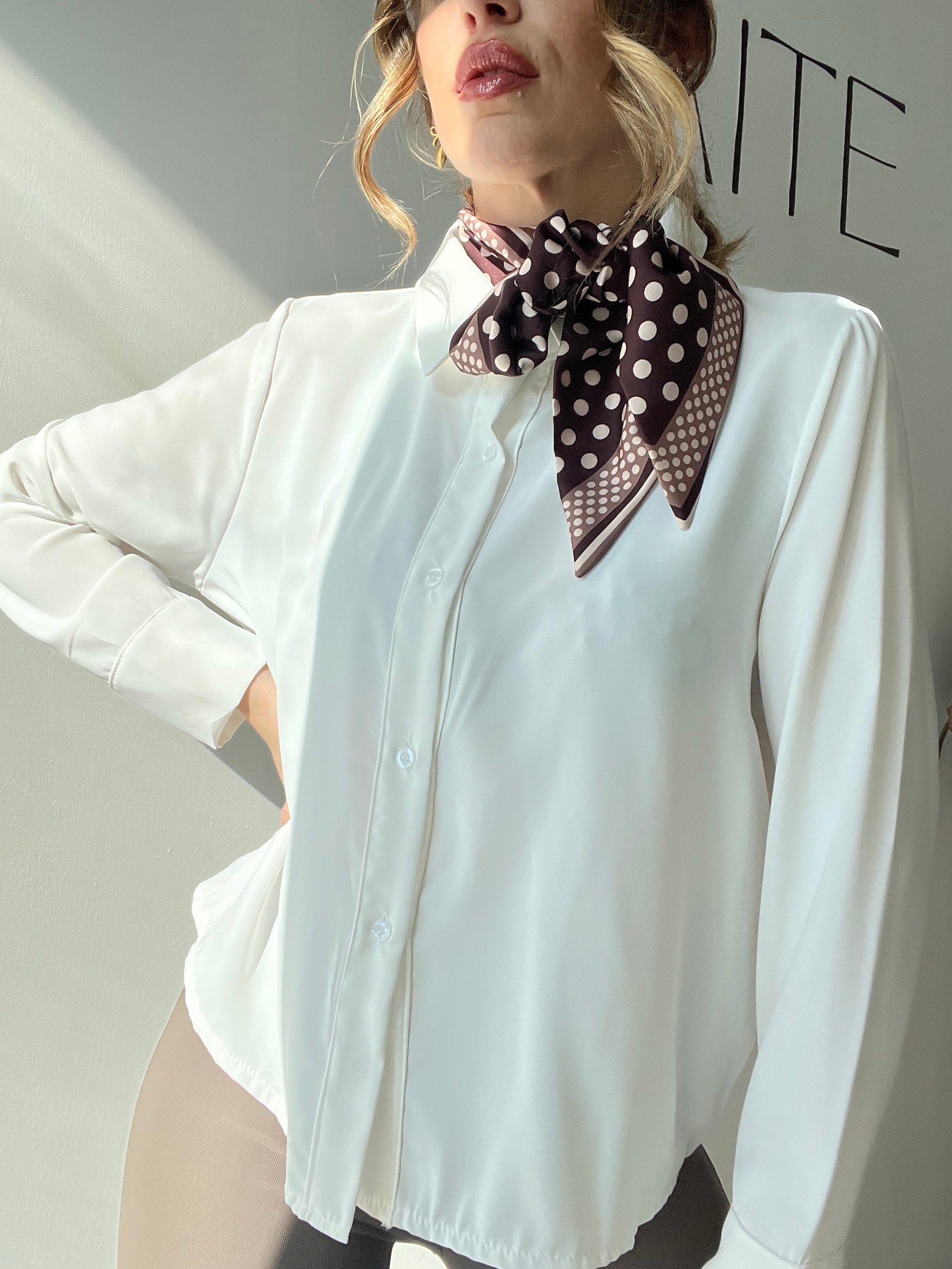 Un capo iconico che unisce classe e versatilità.La camicia bianca Maitè è realizzata in un tessuto morbido e strutturato, con una linea pulita e femminile che valorizza ogni look.Il suo tocco distintivo è il foulard rimovibile in fantasia marrone a pois panna, perfetto per aggiungere un dettaglio raffinato e ricercato. Puoi indossarlo annodato al collo per un effetto bon ton, oppure rimuoverlo per un look più minimal e contemporaneo.Perfetta con pantaloni sartoriali o sotto un blazer per un’eleganza disinvolta.