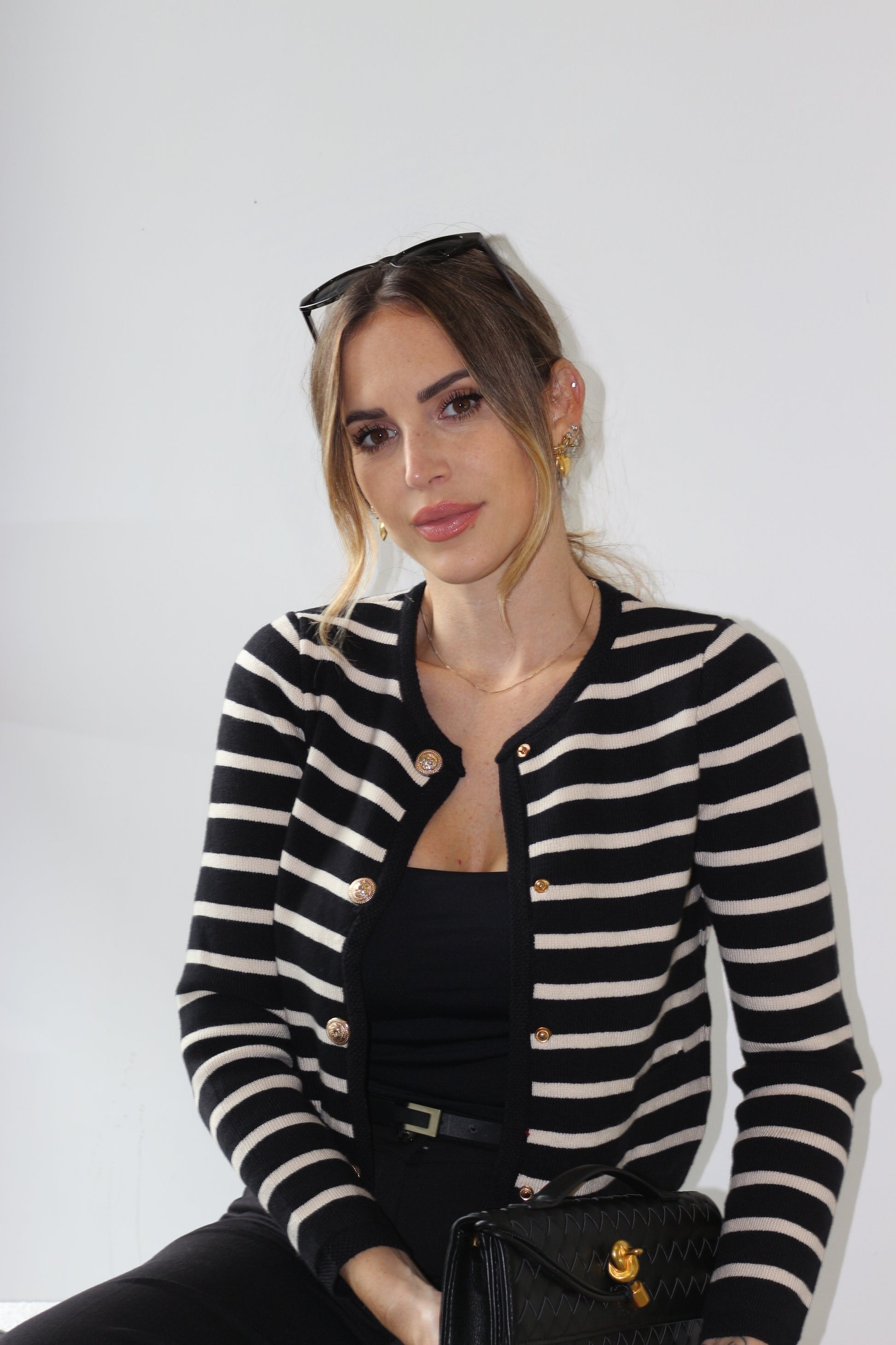 Il Cardigan Riviera Noir è l’emblema dell’eleganza senza tempo. Caratterizzato da righe bianche su fondo nero e impreziosito da bottoni dorati, questo capo unisce il fascino classico allo stile moderno. Il taglio femminile e la vestibilità comoda lo rendono ideale sia per look casual chic che per outfit più raffinati.