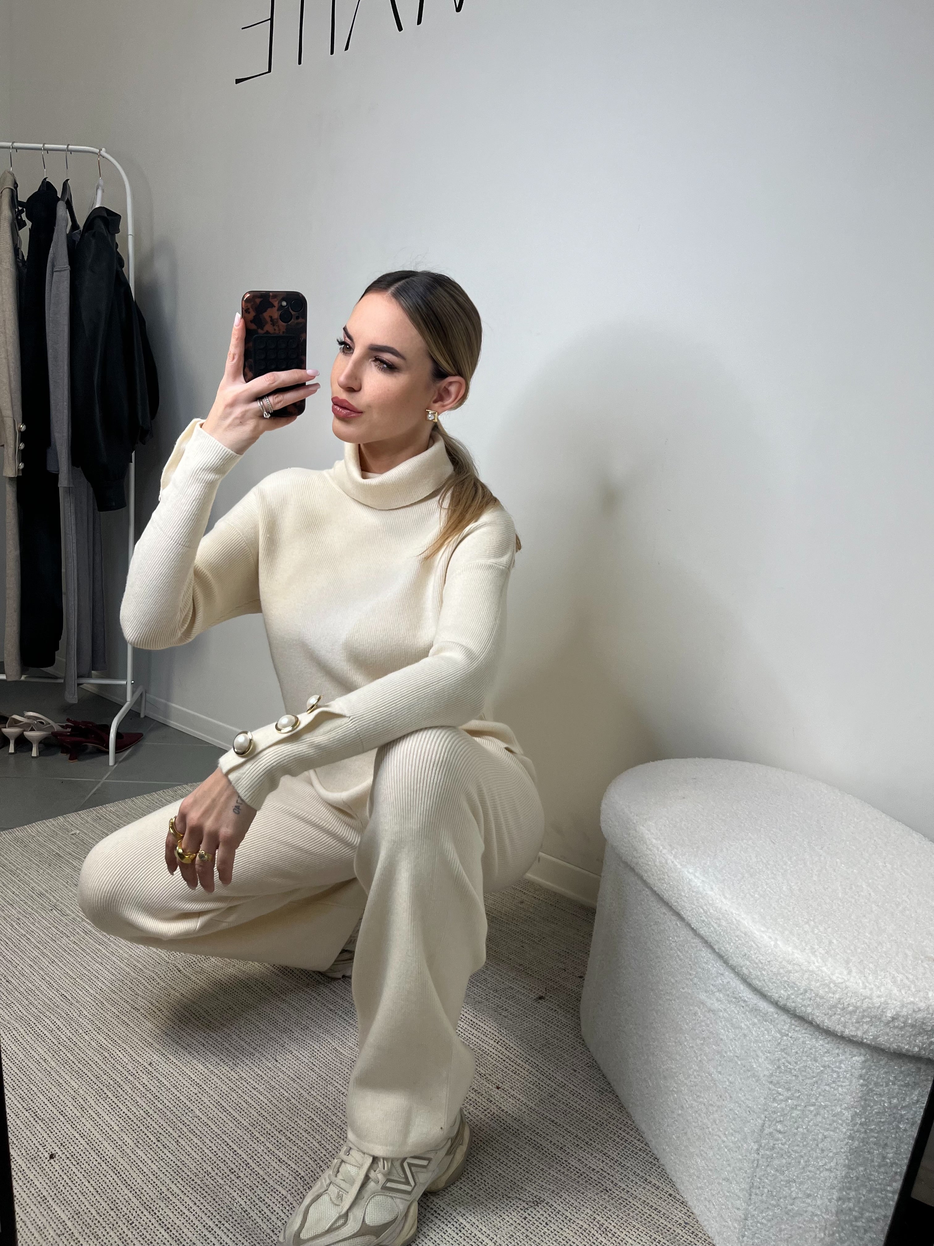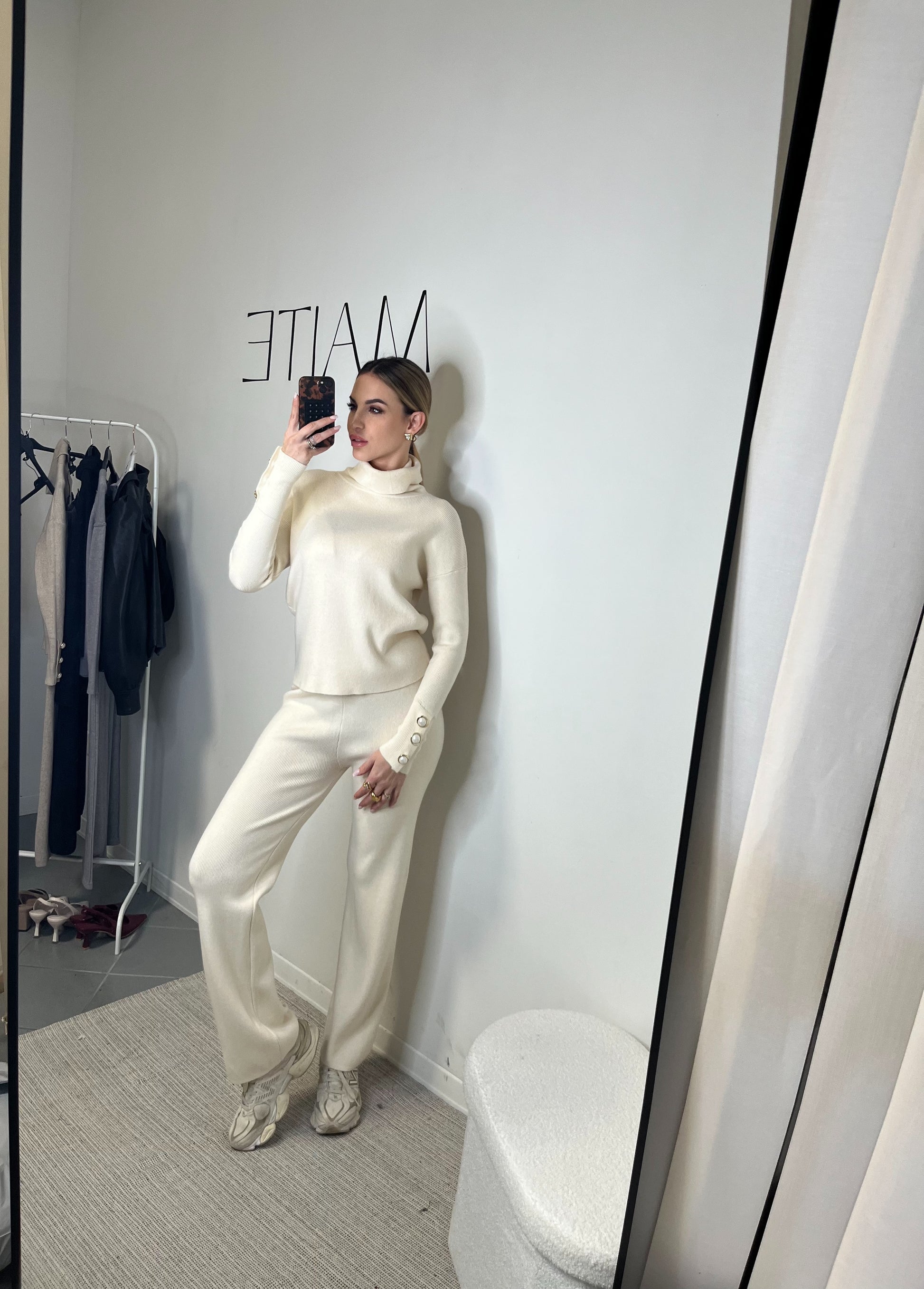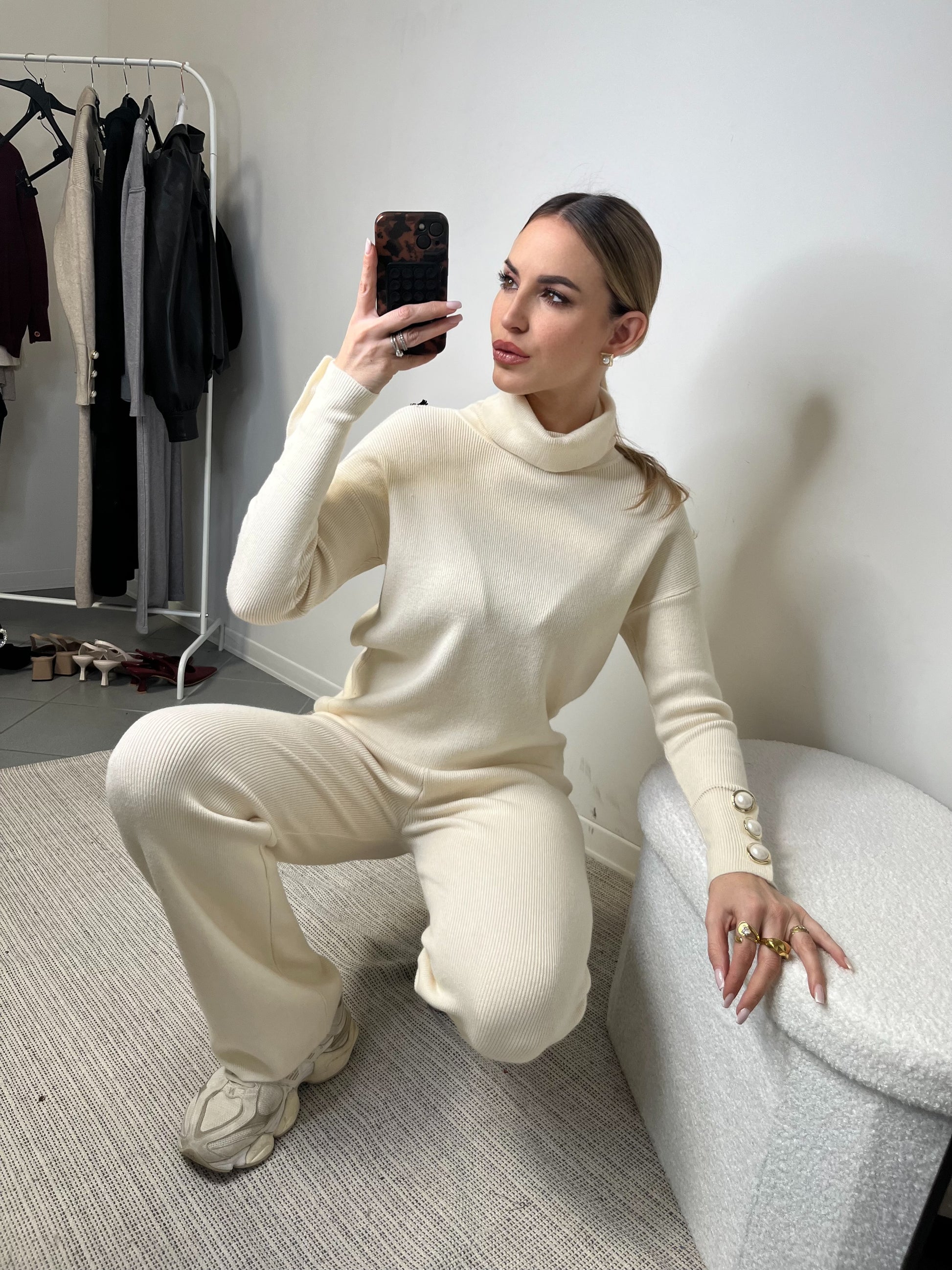 Il maglione a collo alto presenta una linea pulita e sofisticata, arricchita da bottoni gioiello sui polsini che aggiungono un dettaglio luminoso e femminile. Il pantalone a gamba dritta slancia la figura e accompagna i movimenti con naturalezza, regalando una vestibilità comoda ma estremamente elegante.