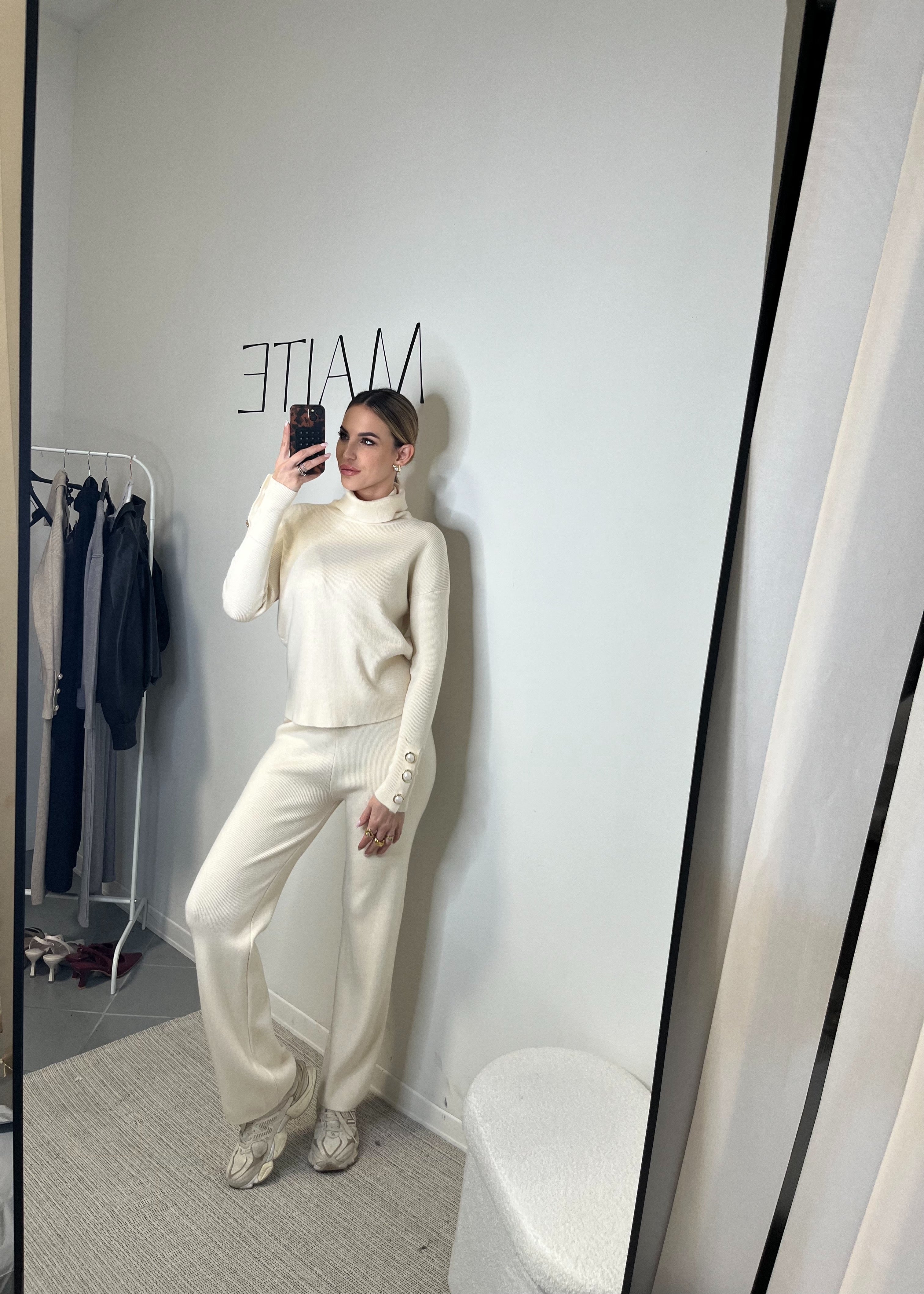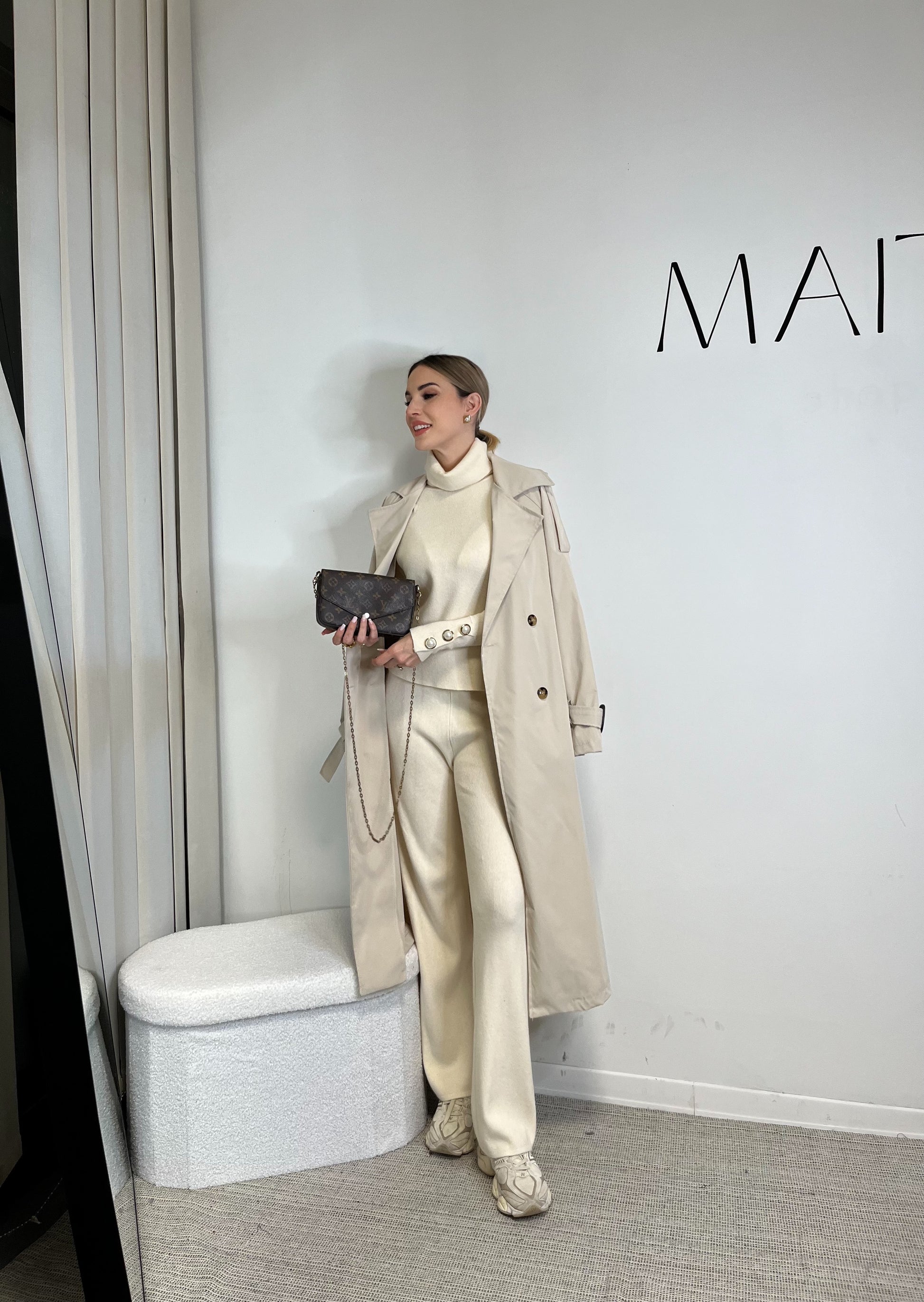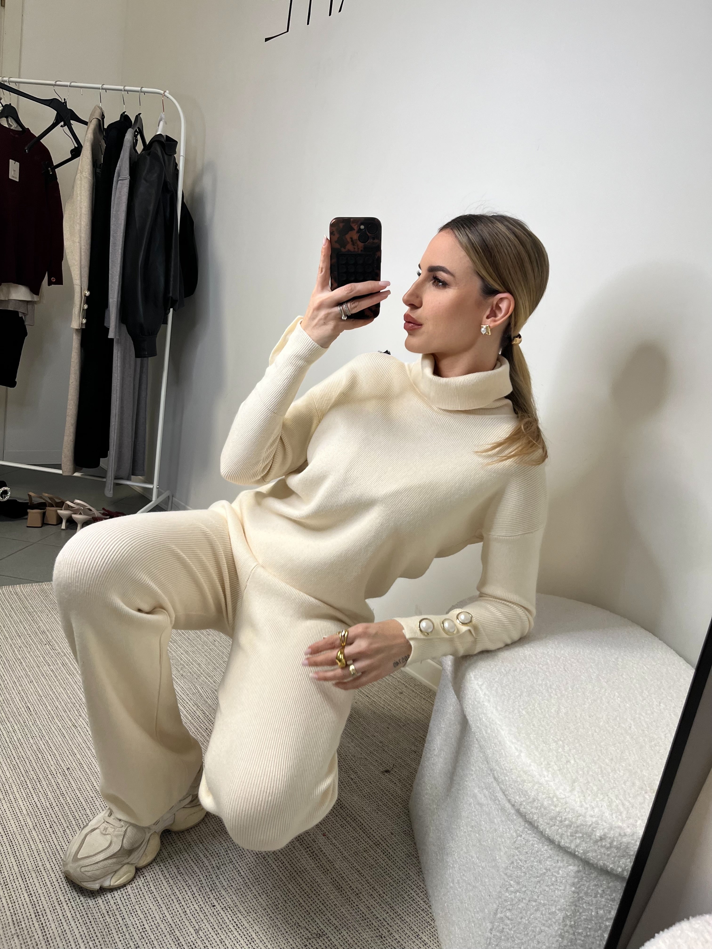 Il maglione a collo alto presenta una linea pulita e sofisticata, arricchita da bottoni gioiello sui polsini che aggiungono un dettaglio luminoso e femminile. Il pantalone a gamba dritta slancia la figura e accompagna i movimenti con naturalezza, regalando una vestibilità comoda ma estremamente elegante.