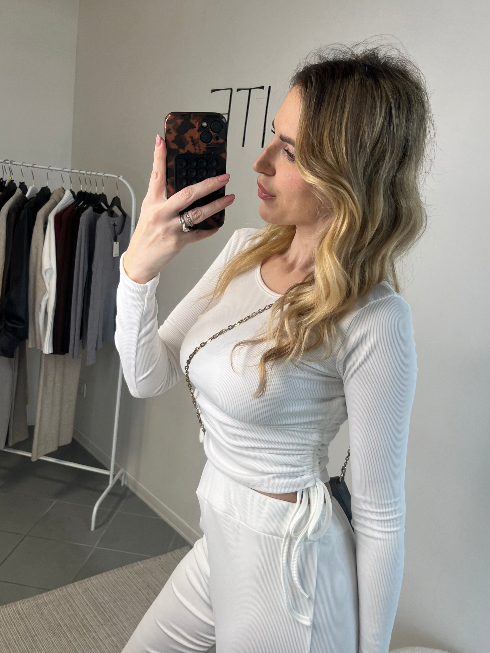 La maglia crop è il vero punto di forza: i cordoncini laterali regolabili permettono di modulare l’altezza a piacere, creando leggere asimmetrie o un effetto più drappeggiato e personalizzato.