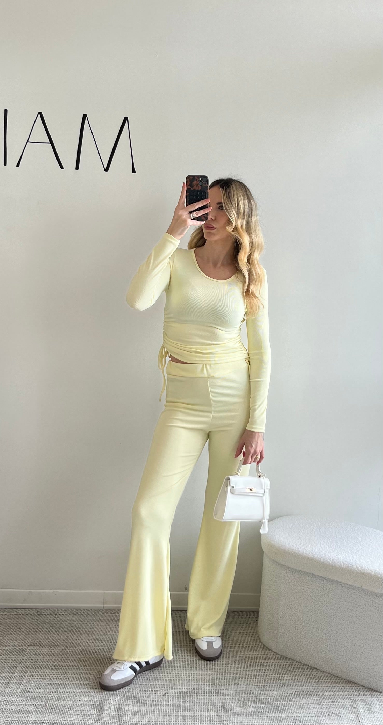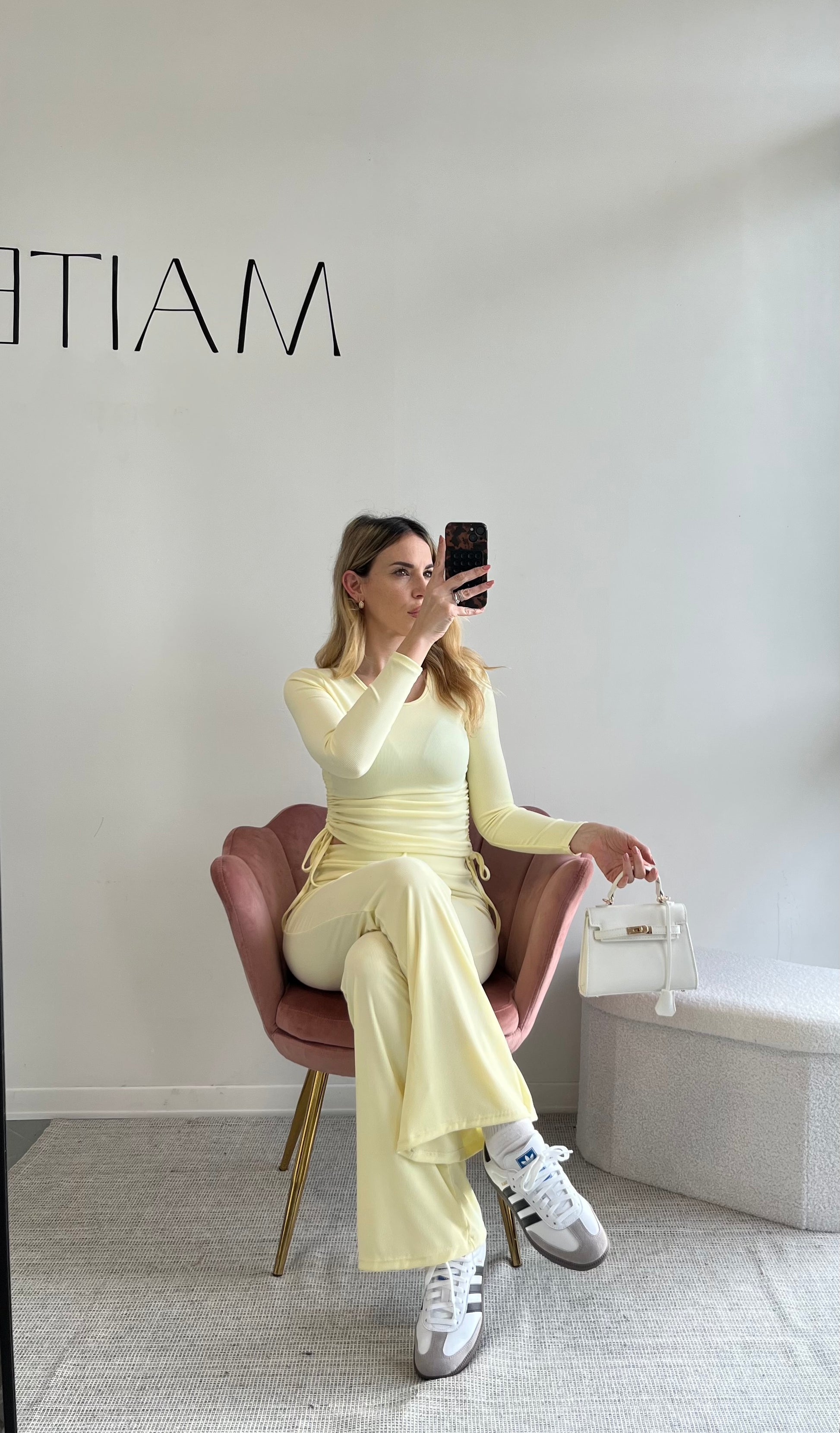 La maglia crop è il vero punto di forza: i cordoncini laterali regolabili permettono di modulare l’altezza a piacere, creando leggere asimmetrie o un effetto più drappeggiato e personalizzato.