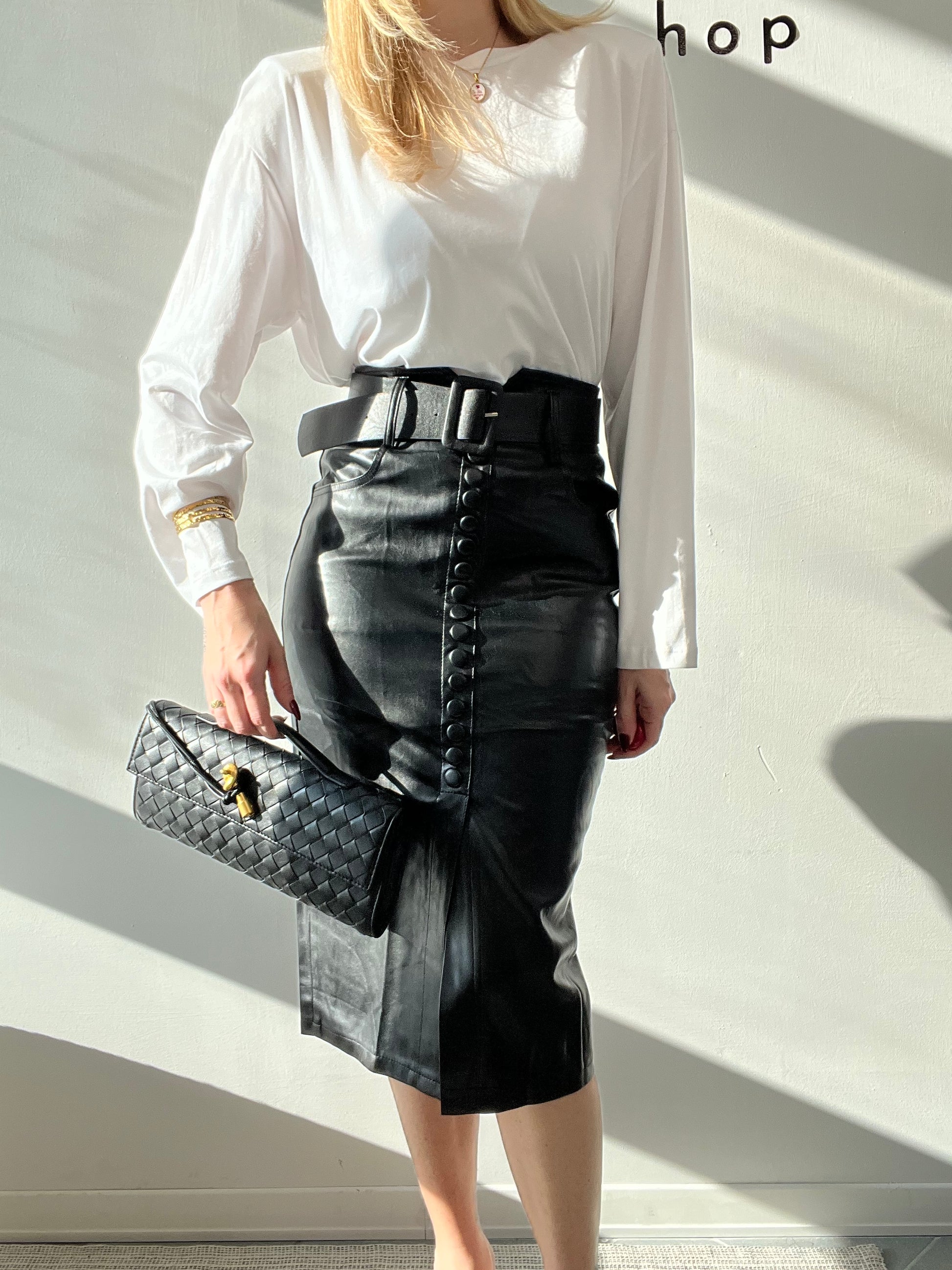 Gonna a vita alta, in ecopelle,marrone scuro.