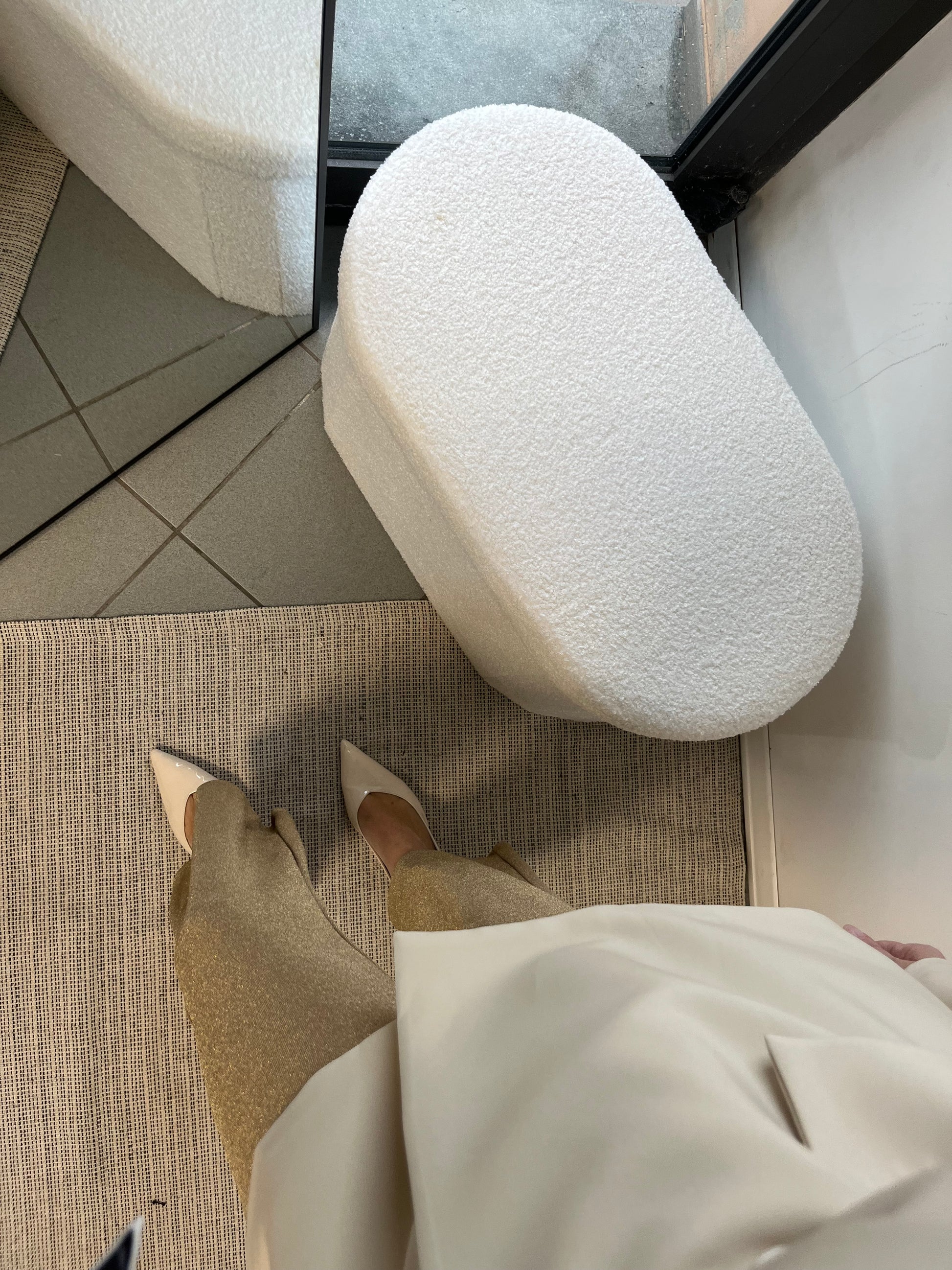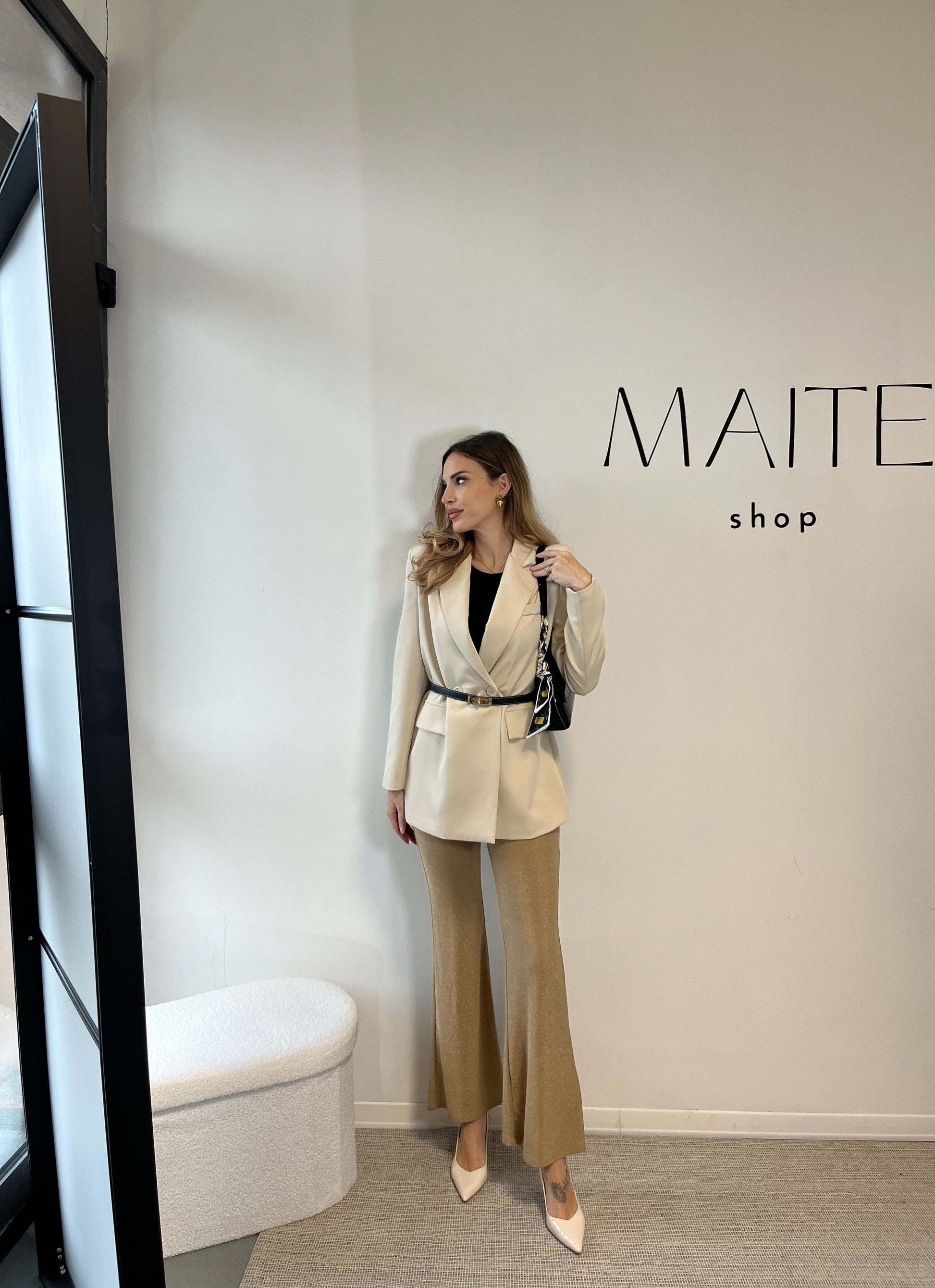 Un capo luminoso e raffinato, perfetto per chi ama distinguersi con eleganza senza rinunciare alla modernità.Il pantalone a zampa in lurex color champagne esalta la figura grazie al suo taglio fluido e alla vestibilità elasticizzata, che avvolge con delicatezza senza stringere.Il tessuto in lurex regala una luminosità discreta, ideale per look serali o per aggiungere un tocco sofisticato anche agli outfit quotidiani.