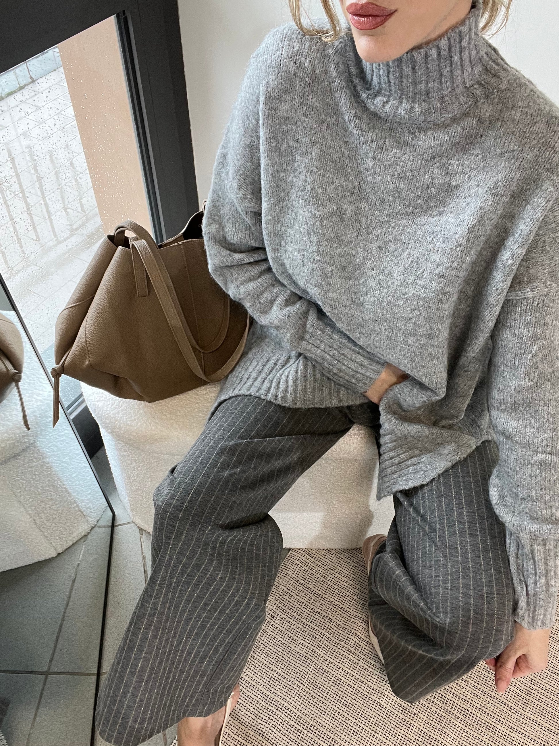 Pull grigio effetto cashmere con spacchetti laterali manica lunga collo alto