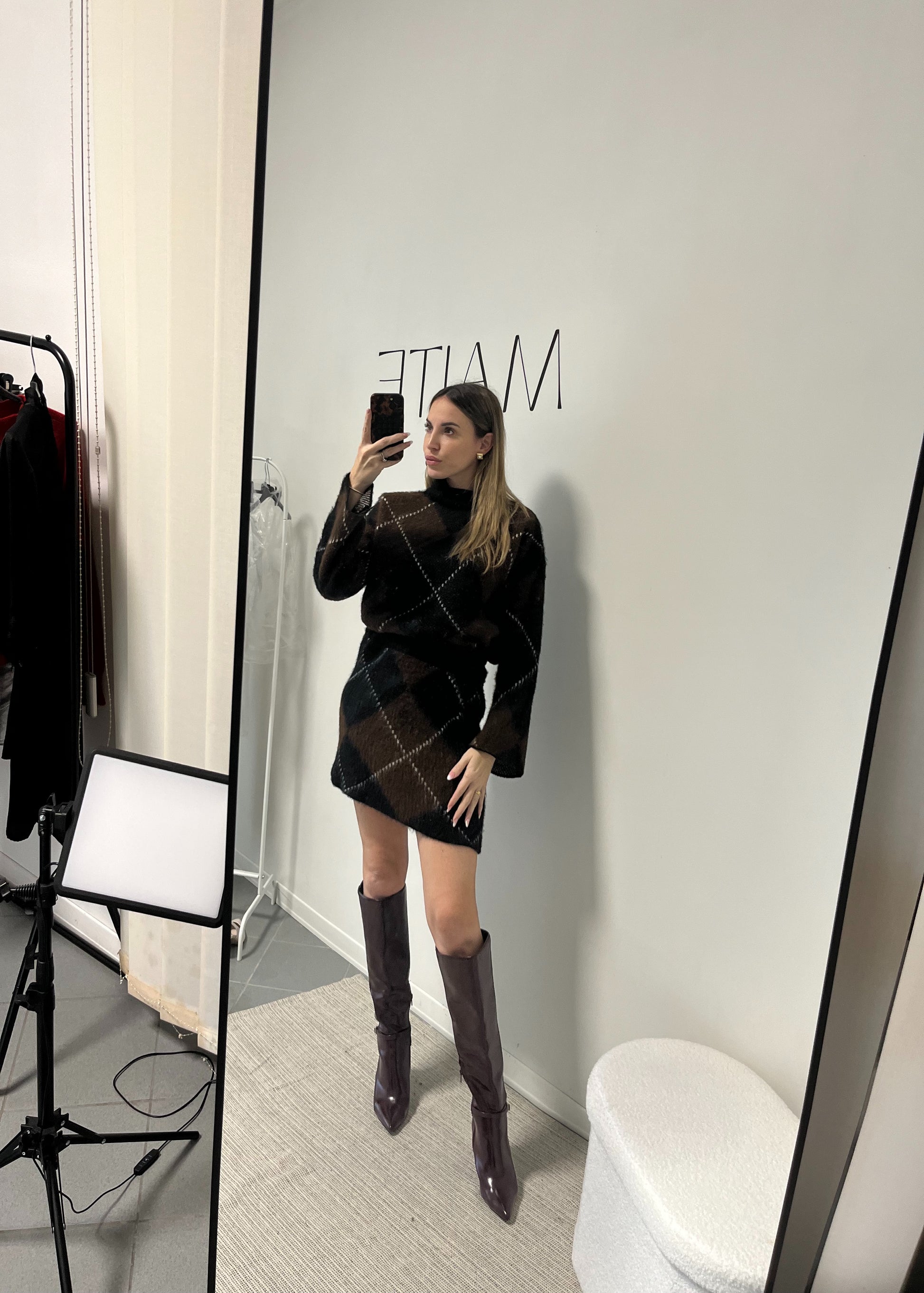 • Maglia: Morbido pullover a collo alto con maniche lunghe, caratterizzato dalla seducente fantasia Argyle (a rombi). La palette scura di marrone, nero è attraversata da sottili linee a contrasto che illuminano la trama. La lunghezza della gonna lo rende versatile per ogni occasione.