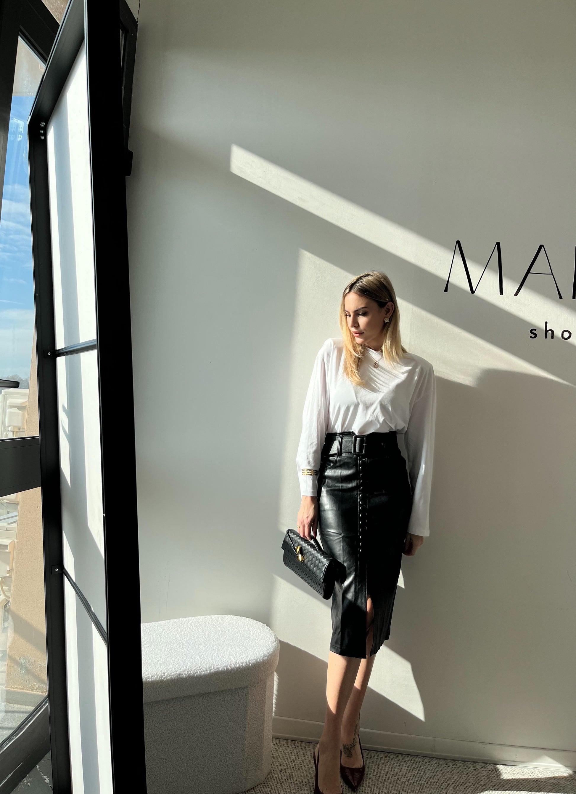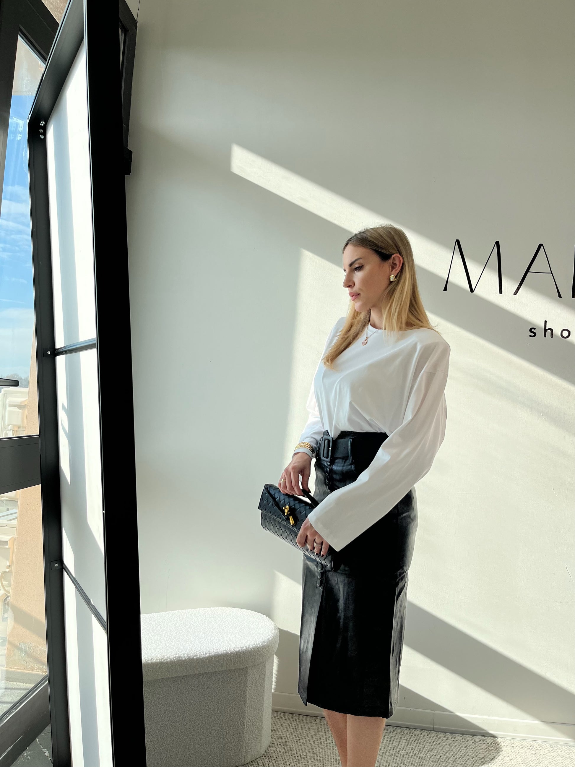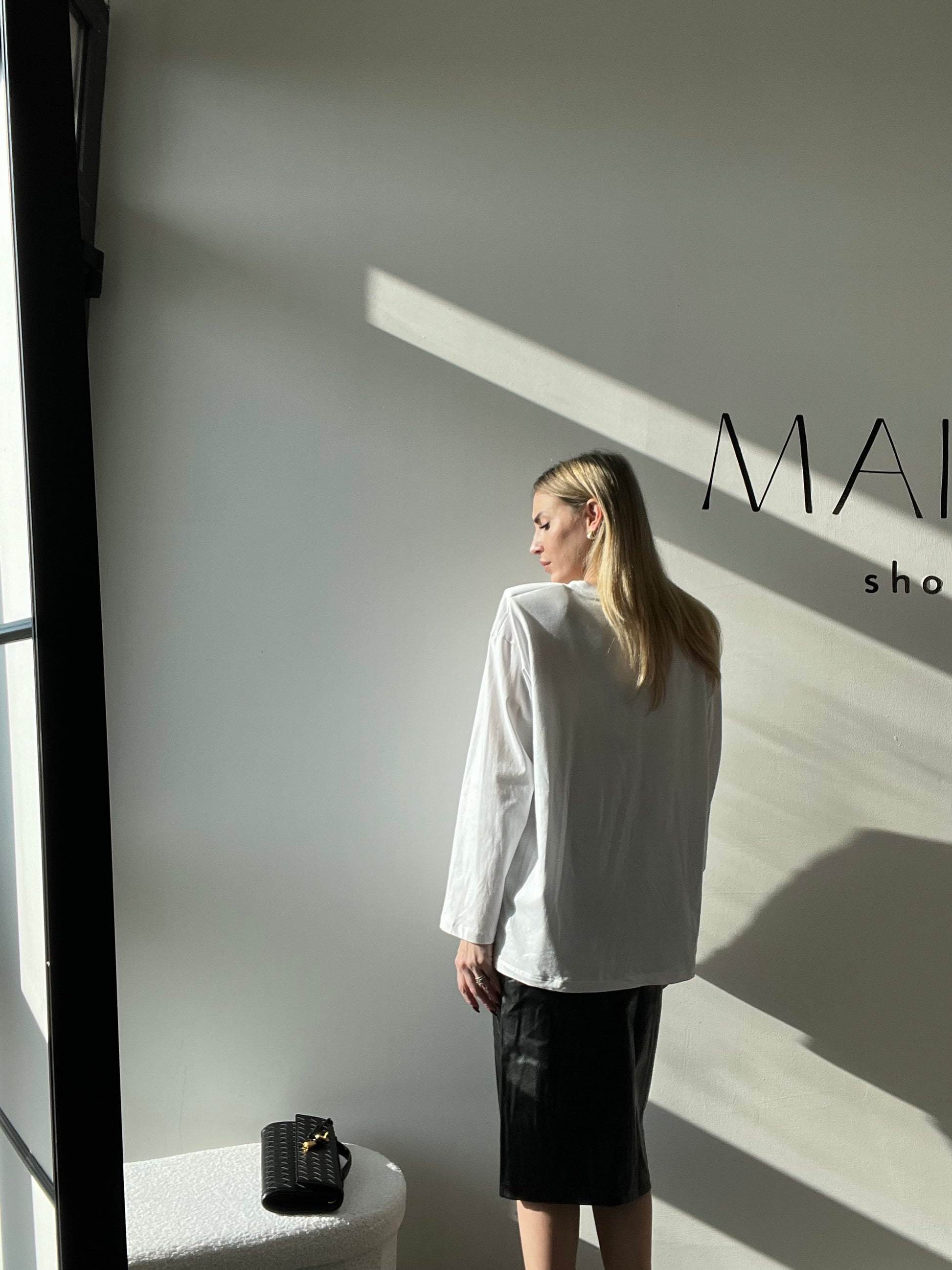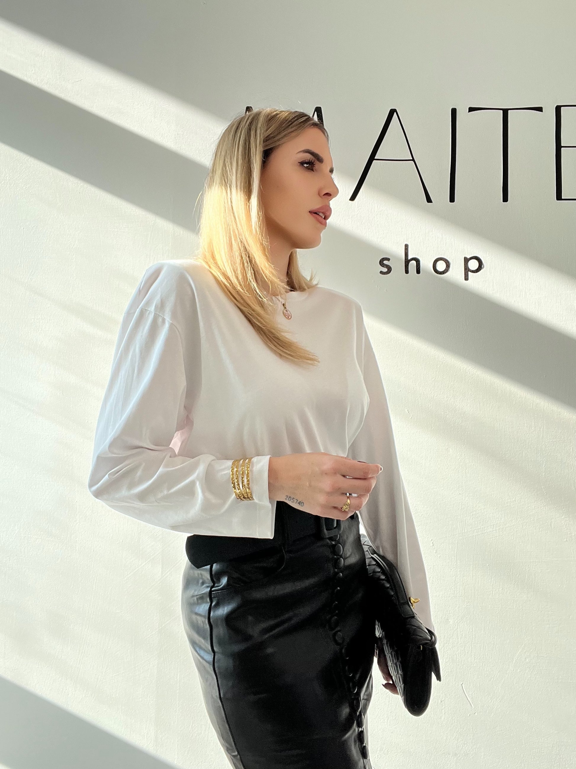 T-shirt manica lunga girocollo, spallina leggermente imbottita manica ampia, lunghezza extra.