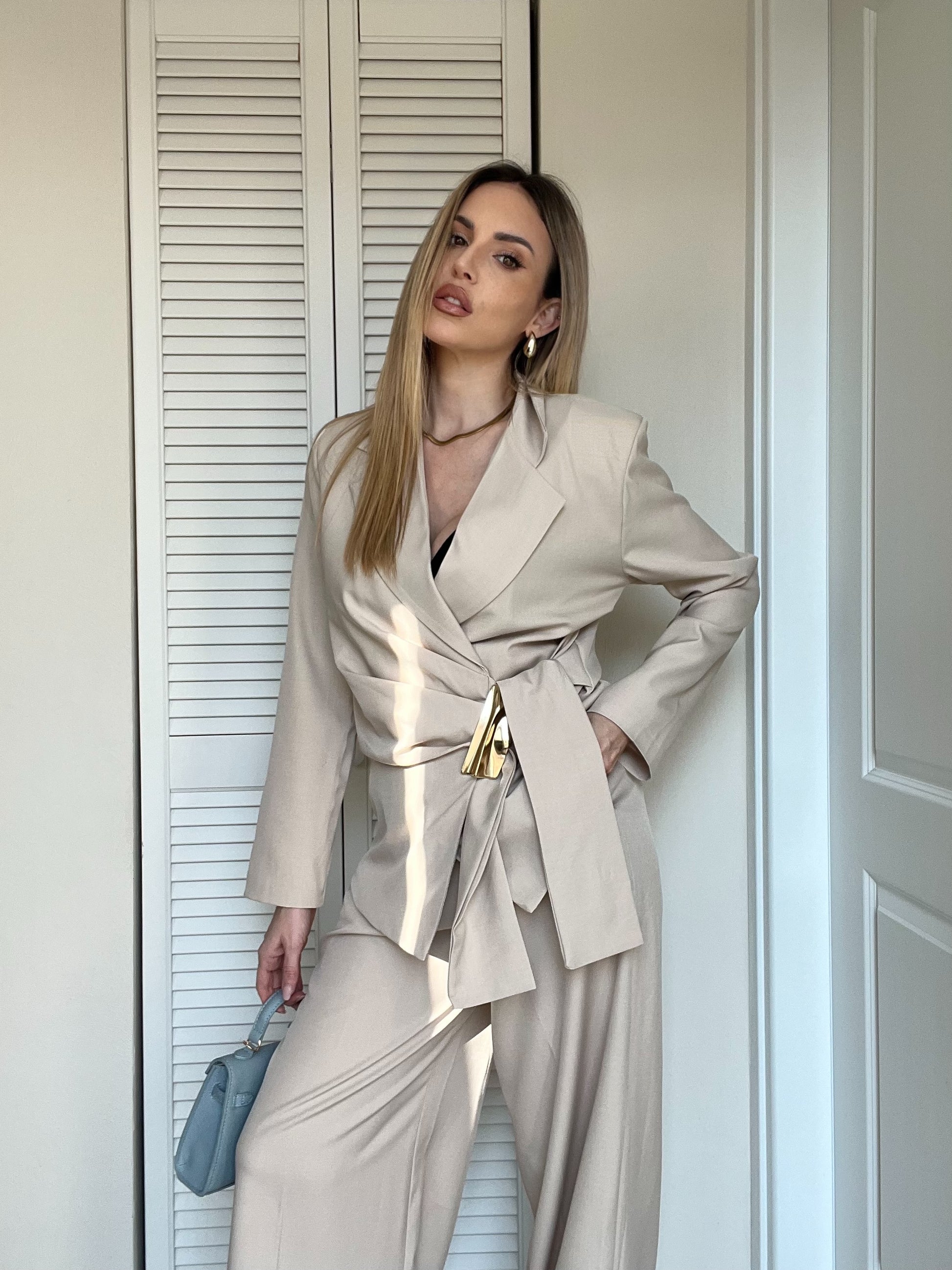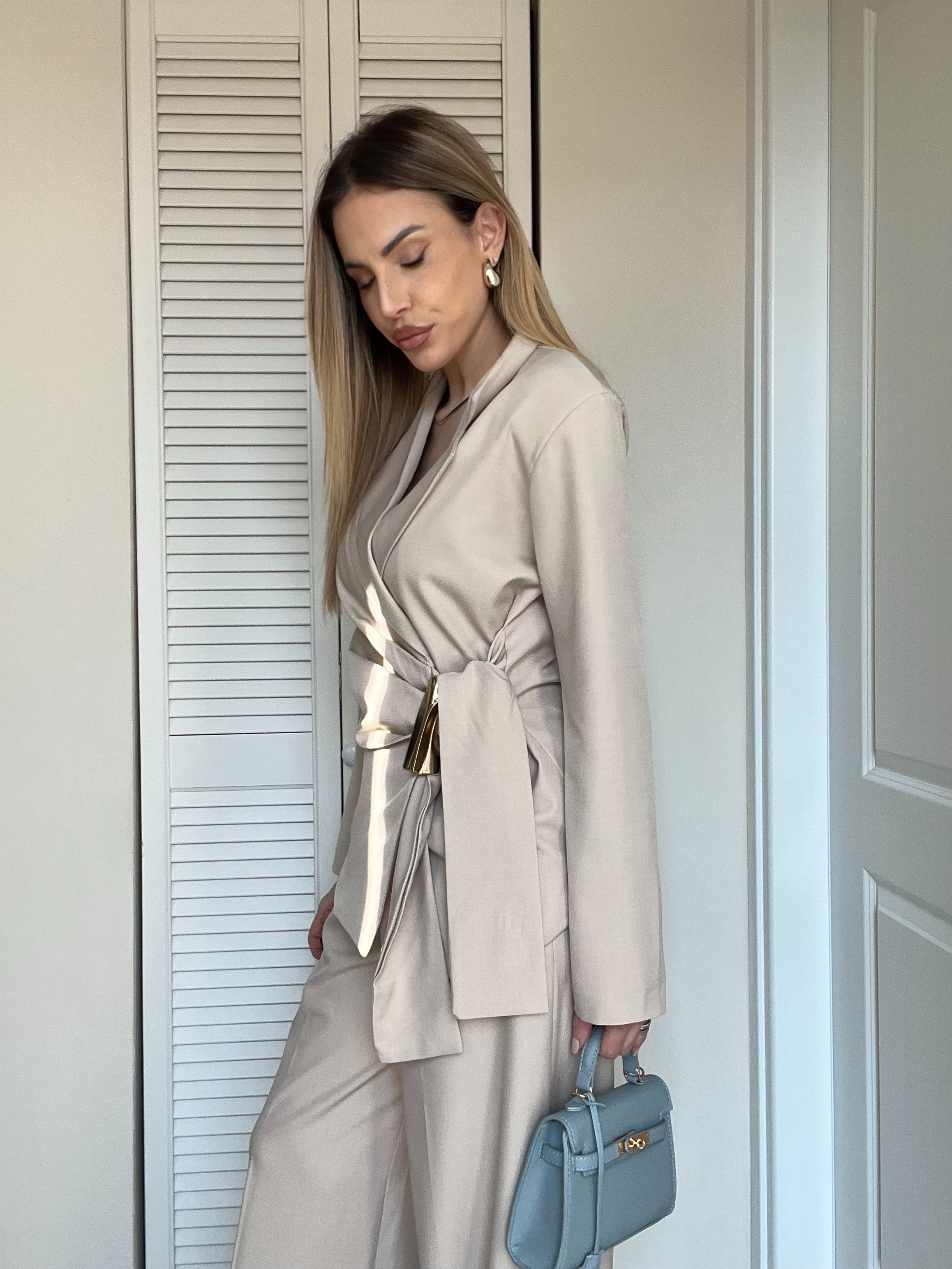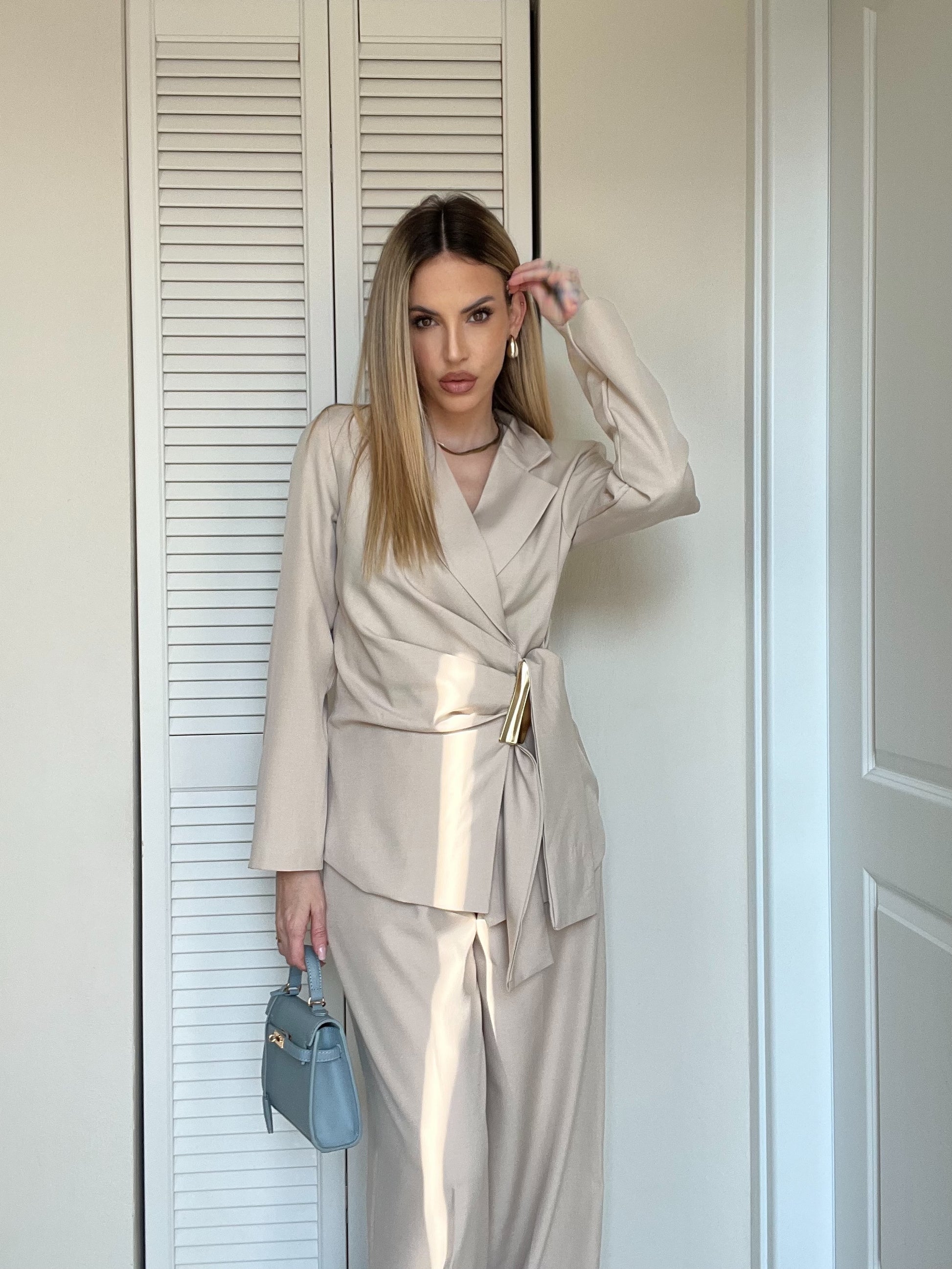 Giacca a Portafoglio: Design incrociato con chiusura laterale arricchita da un maxi dettaglio metallico gold che definisce il punto vita con luce e carattere.